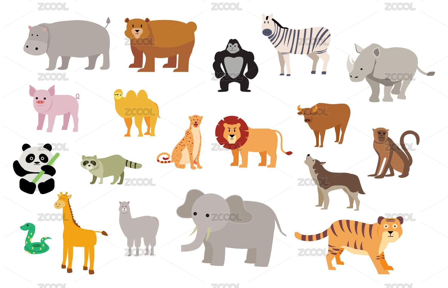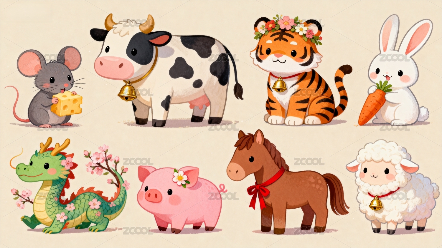 十二生肖的小动物齐聚和小女孩-治愈插画