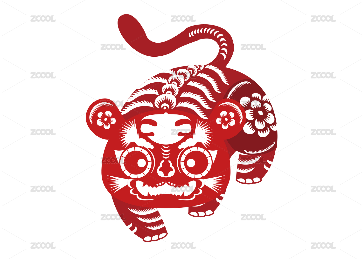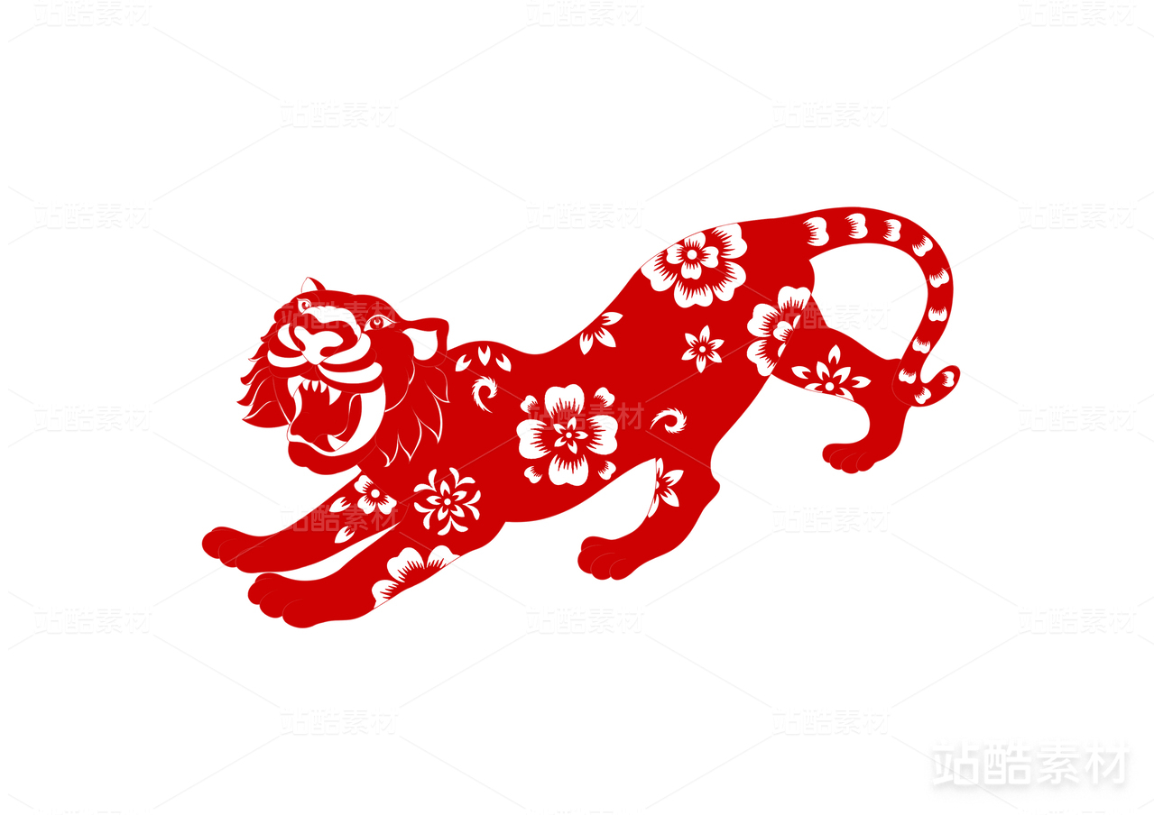 十二生肖虎绣球牡丹梅花铜钱虎年红色剪纸插画