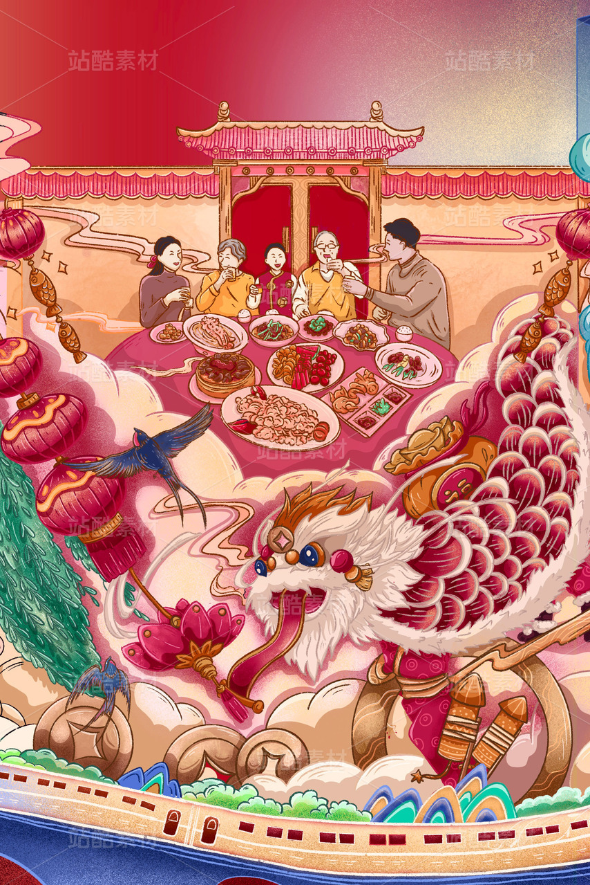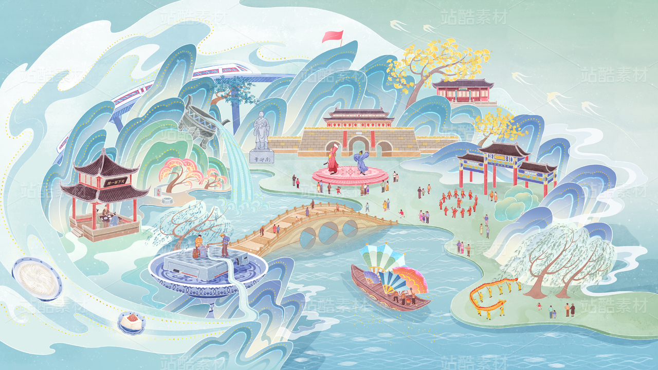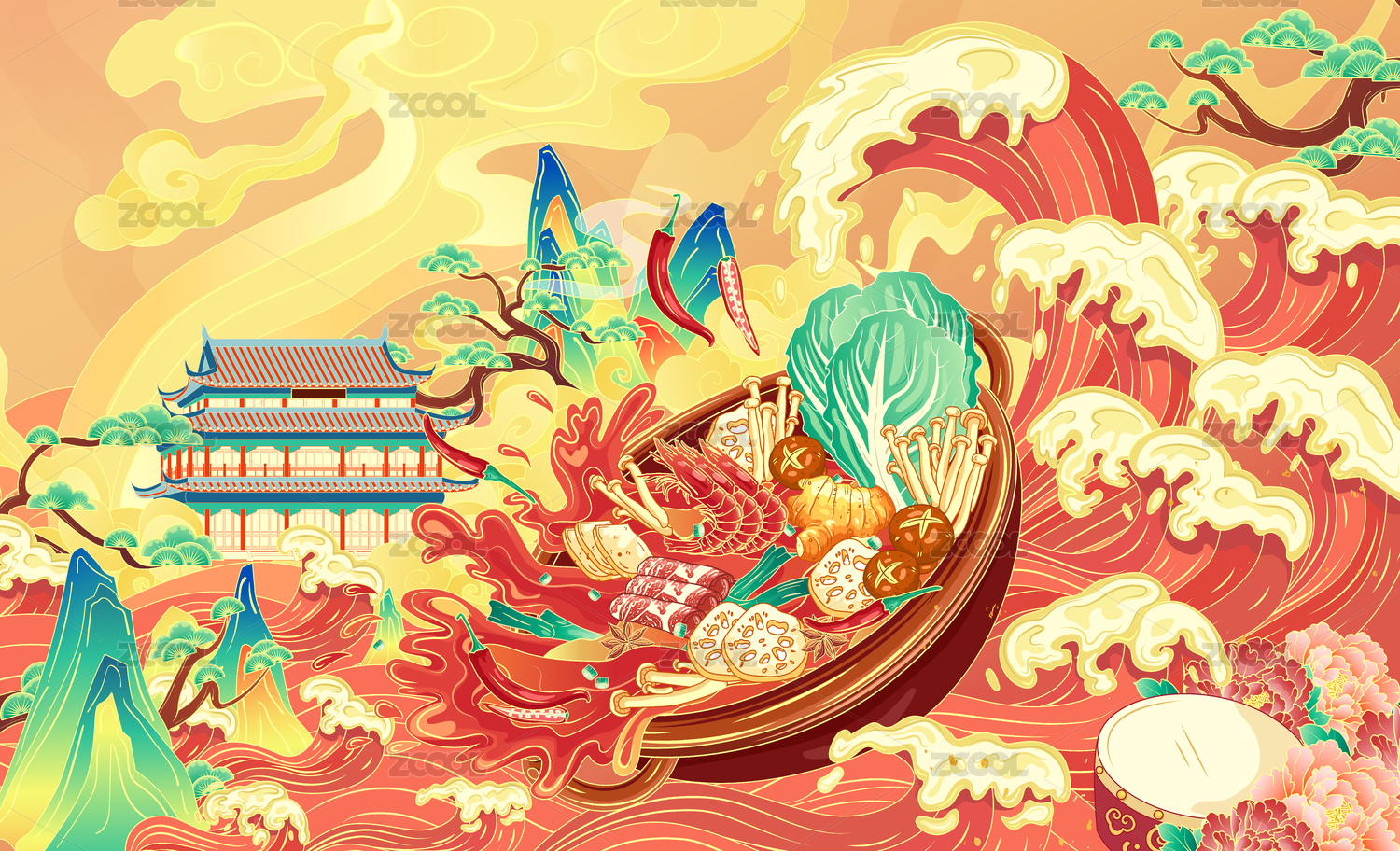 龙城濮阳的城市建筑与美食缩影,中国风插画