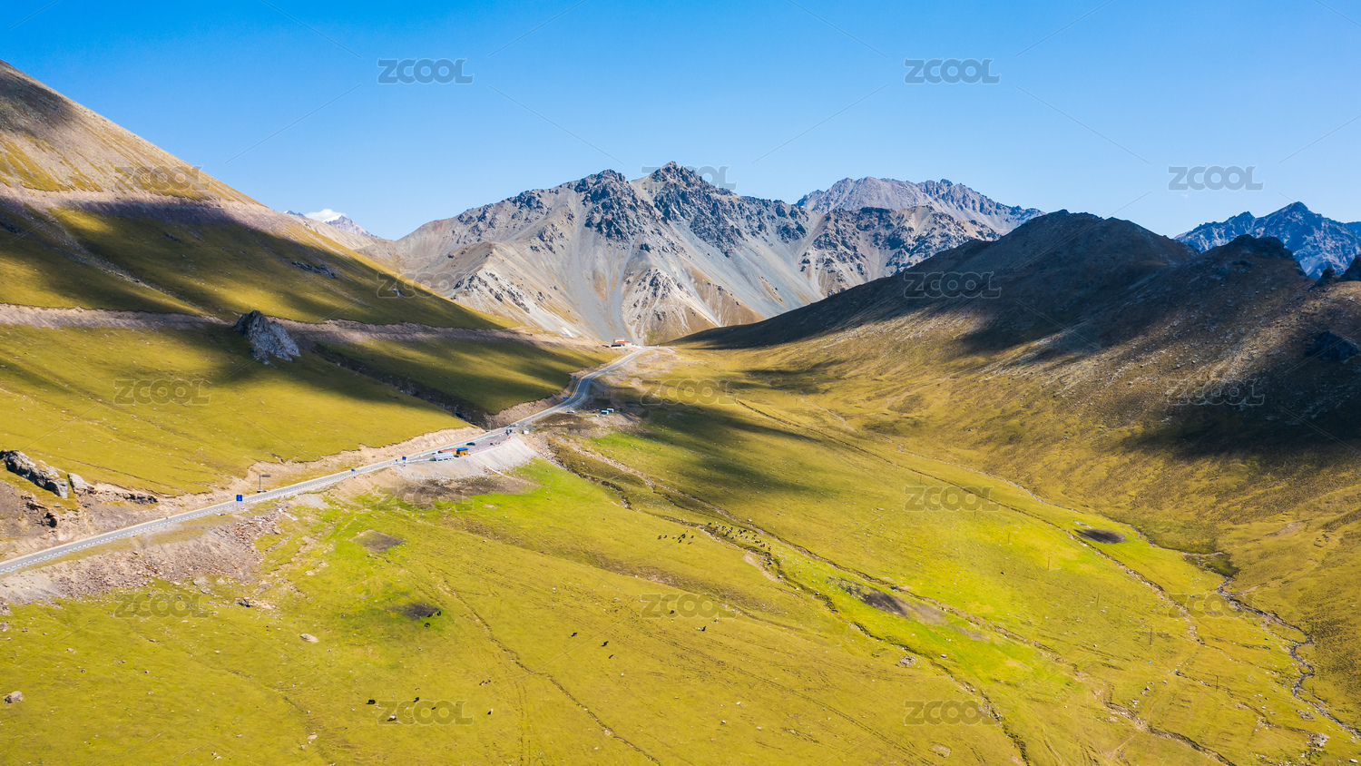 中国新疆夏季蓝天白云下G217独库公路沿途高山草原