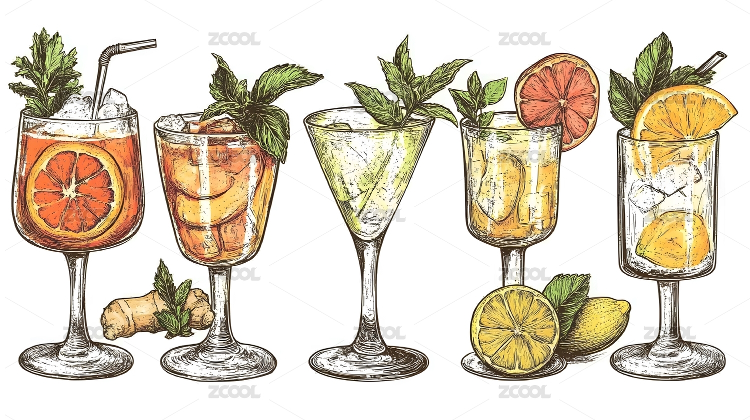 鸡尾酒,调酒,饮料,水果,柠檬,橙子,葡萄柚,酒杯,插画,手绘