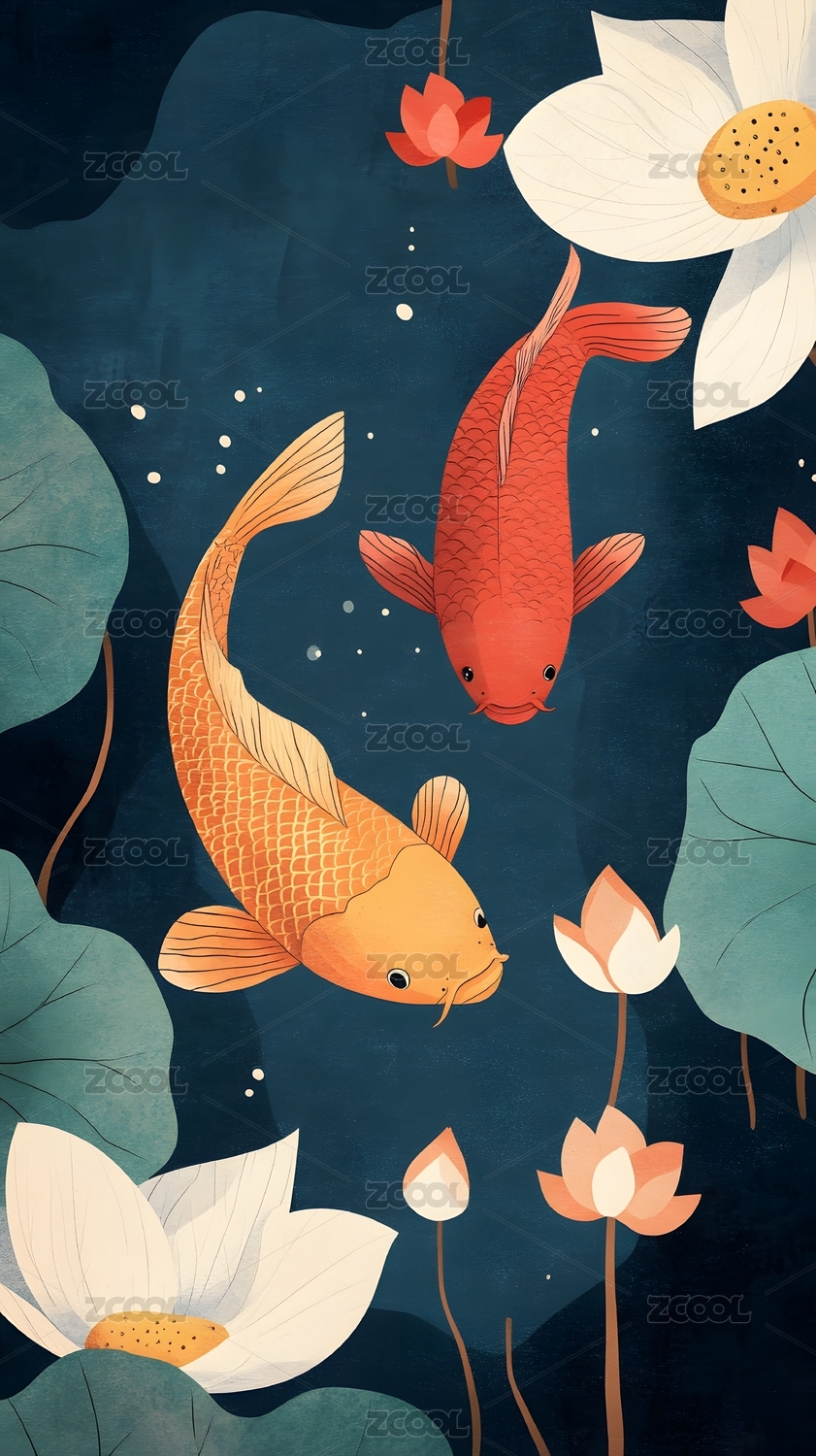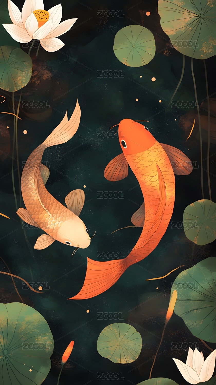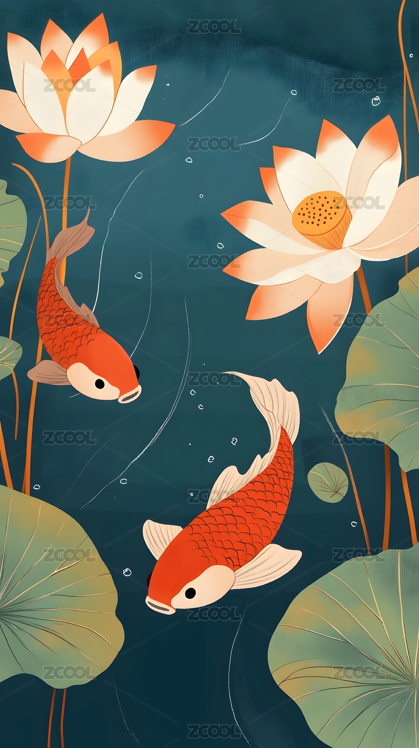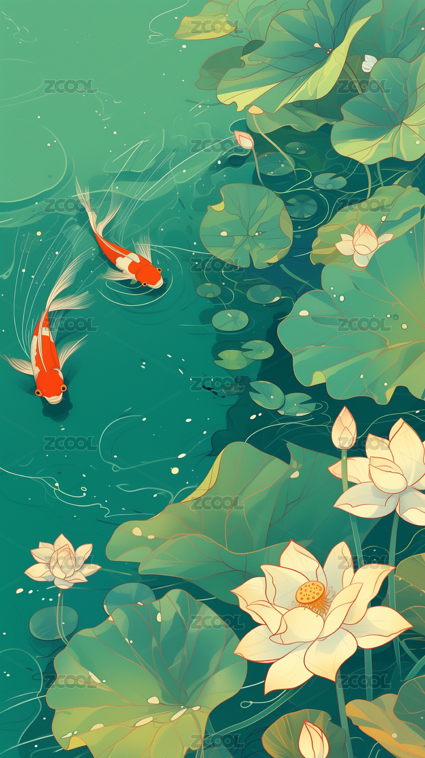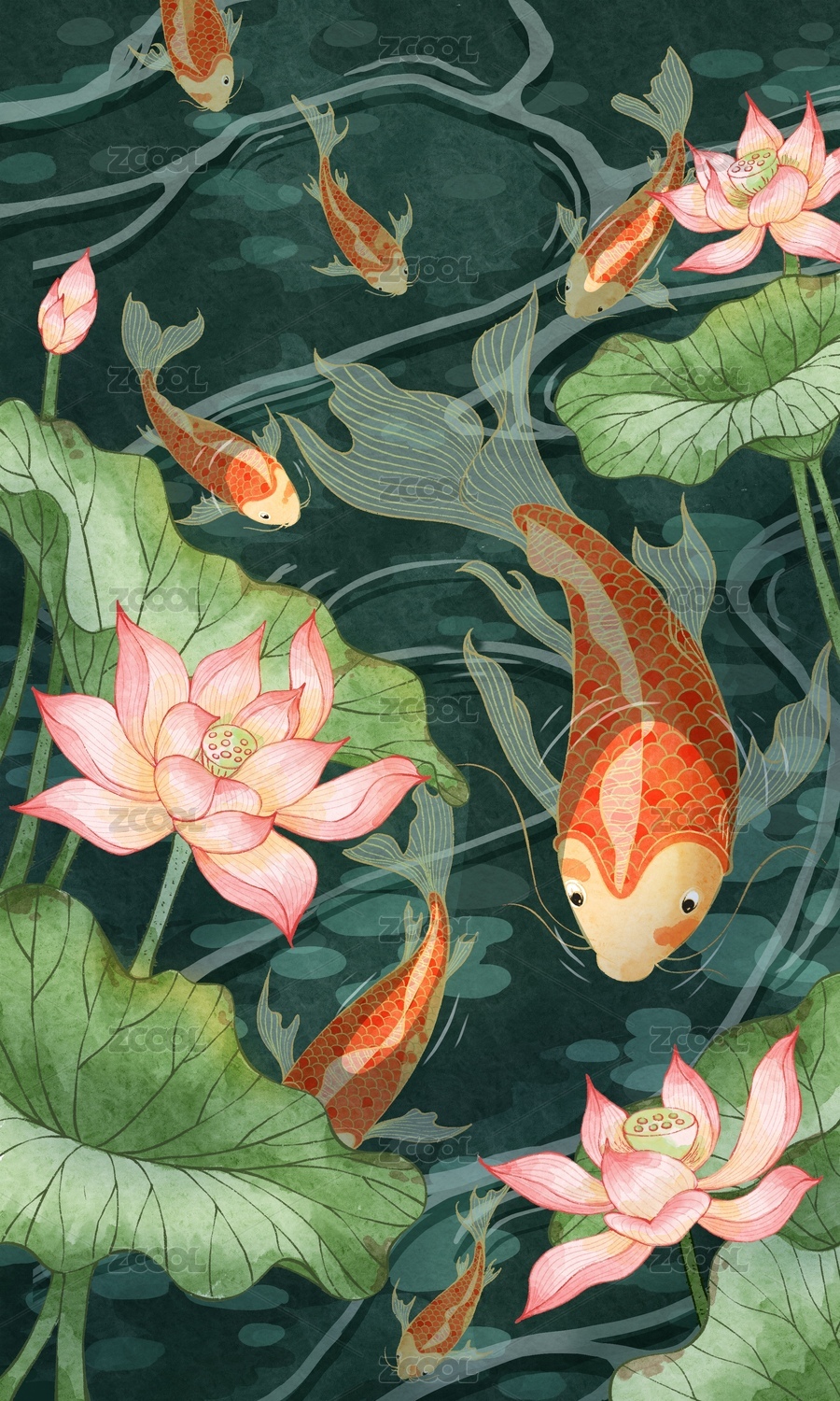 橙色, 插画, 静物,金鱼, 荷叶, 荷花, 水塘, 鱼, 绿色, 水彩