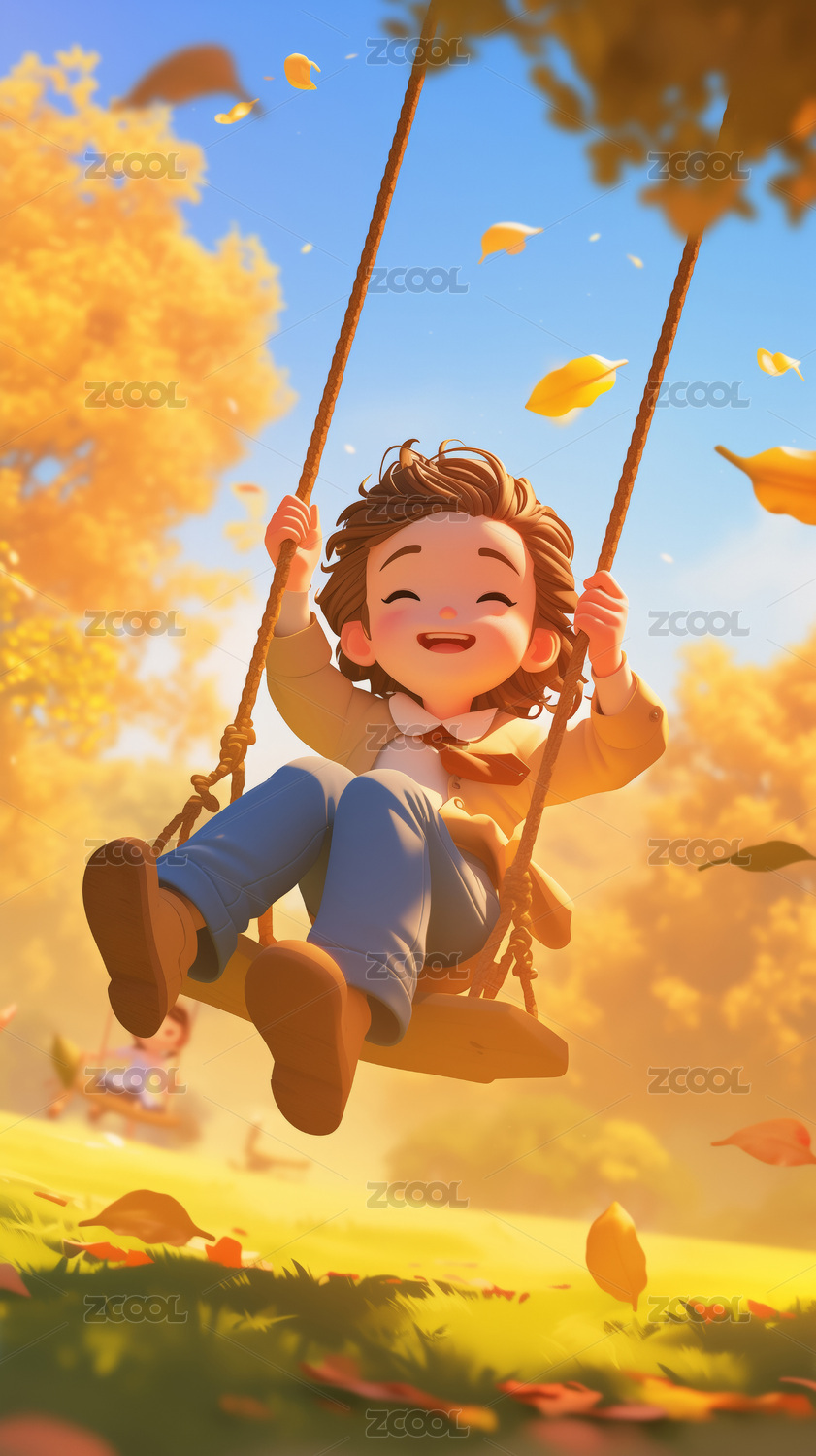 秋日公园里骑自行车的小男孩3d卡通风格