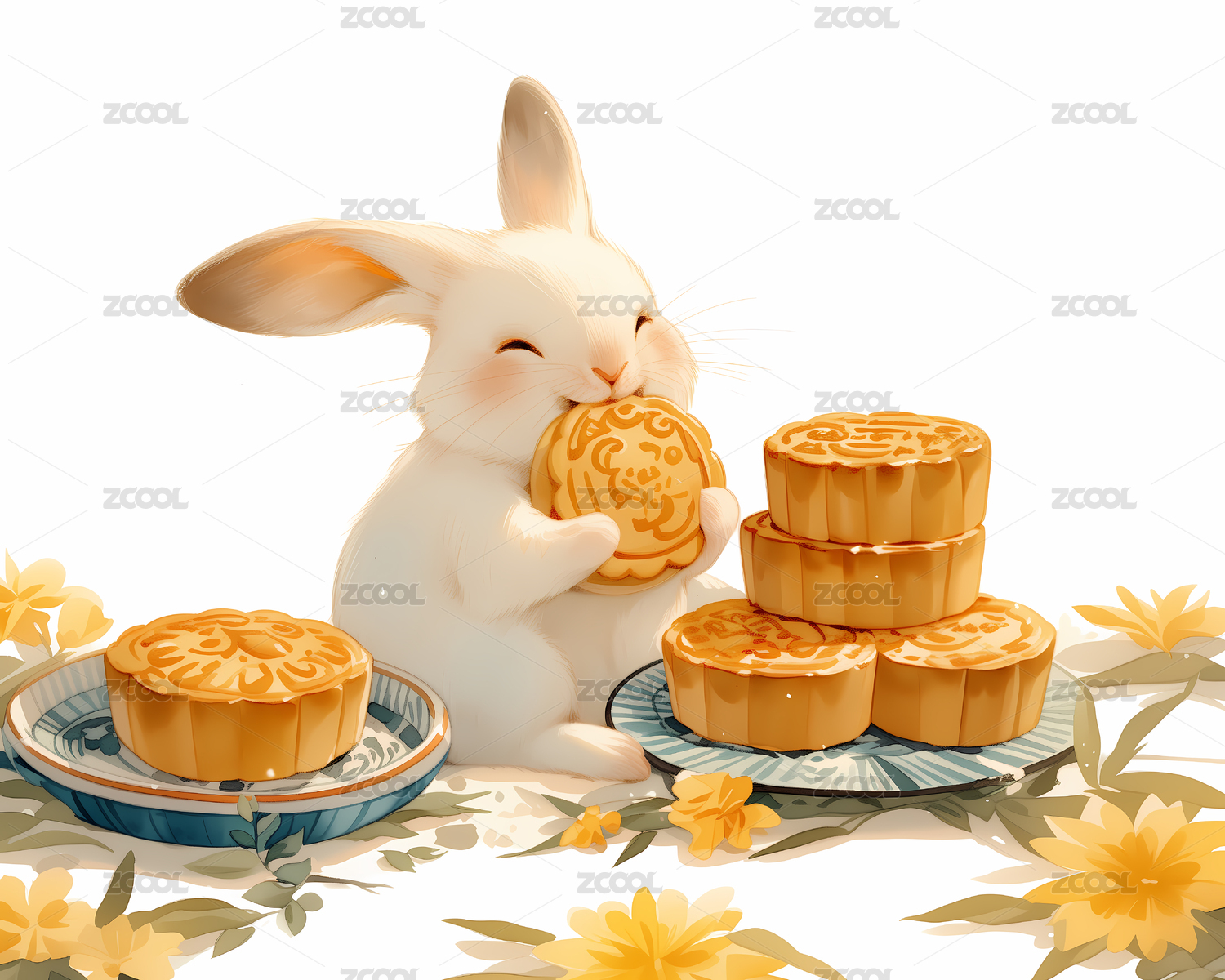 一个小白兔抱着月饼中秋节月饼盘子水彩插画
