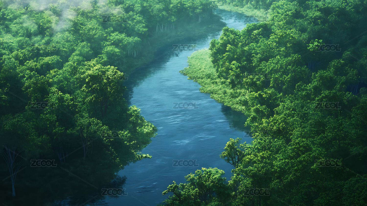 热带雨林和蜿蜒曲折的河流自然风光航拍