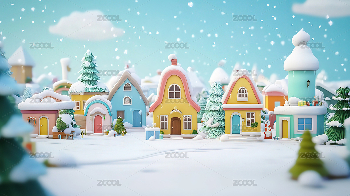 卡通圣诞冬季快乐场景与雪中小镇儿童插图