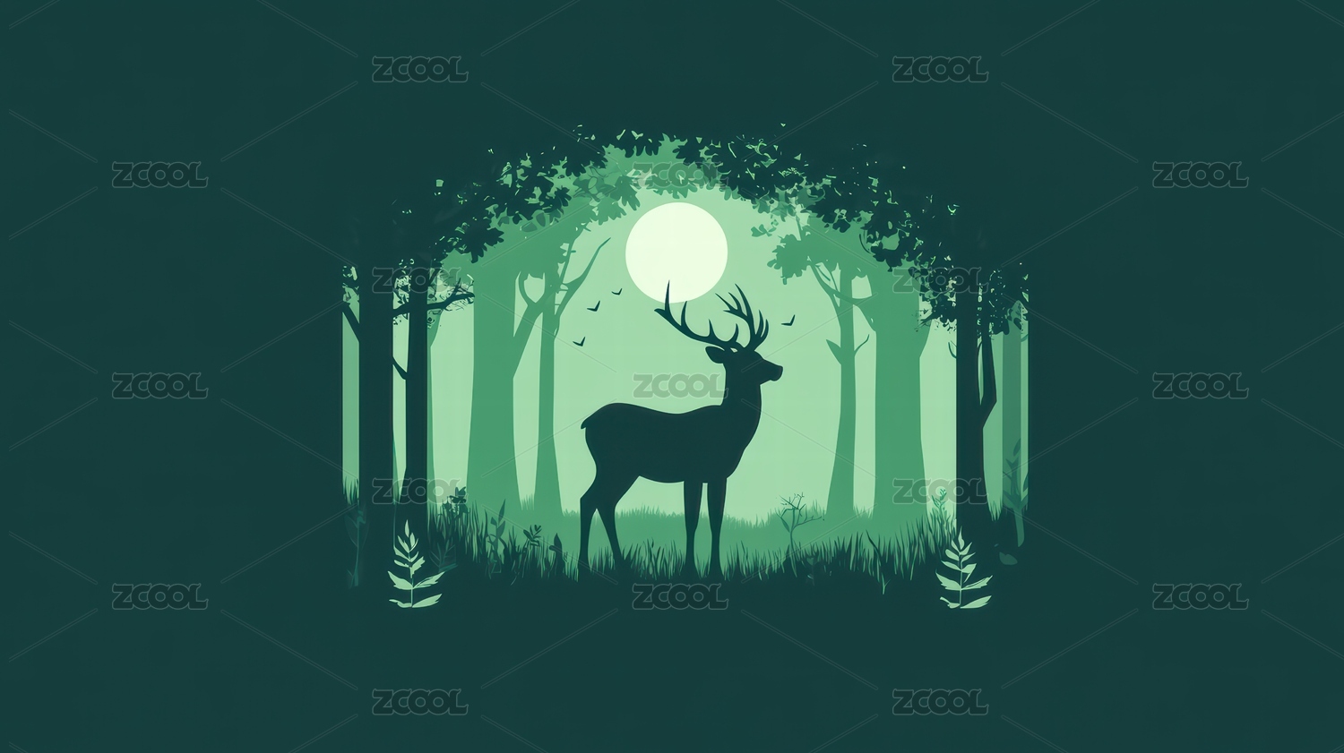 冬日森林中麋鹿剪影呈现的温暖节庆意境