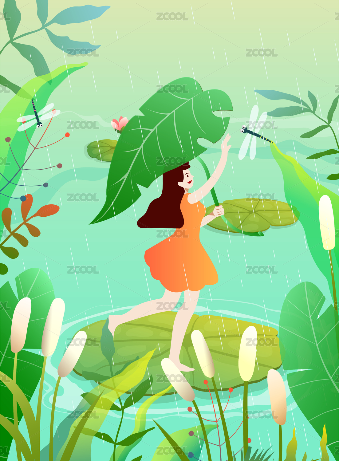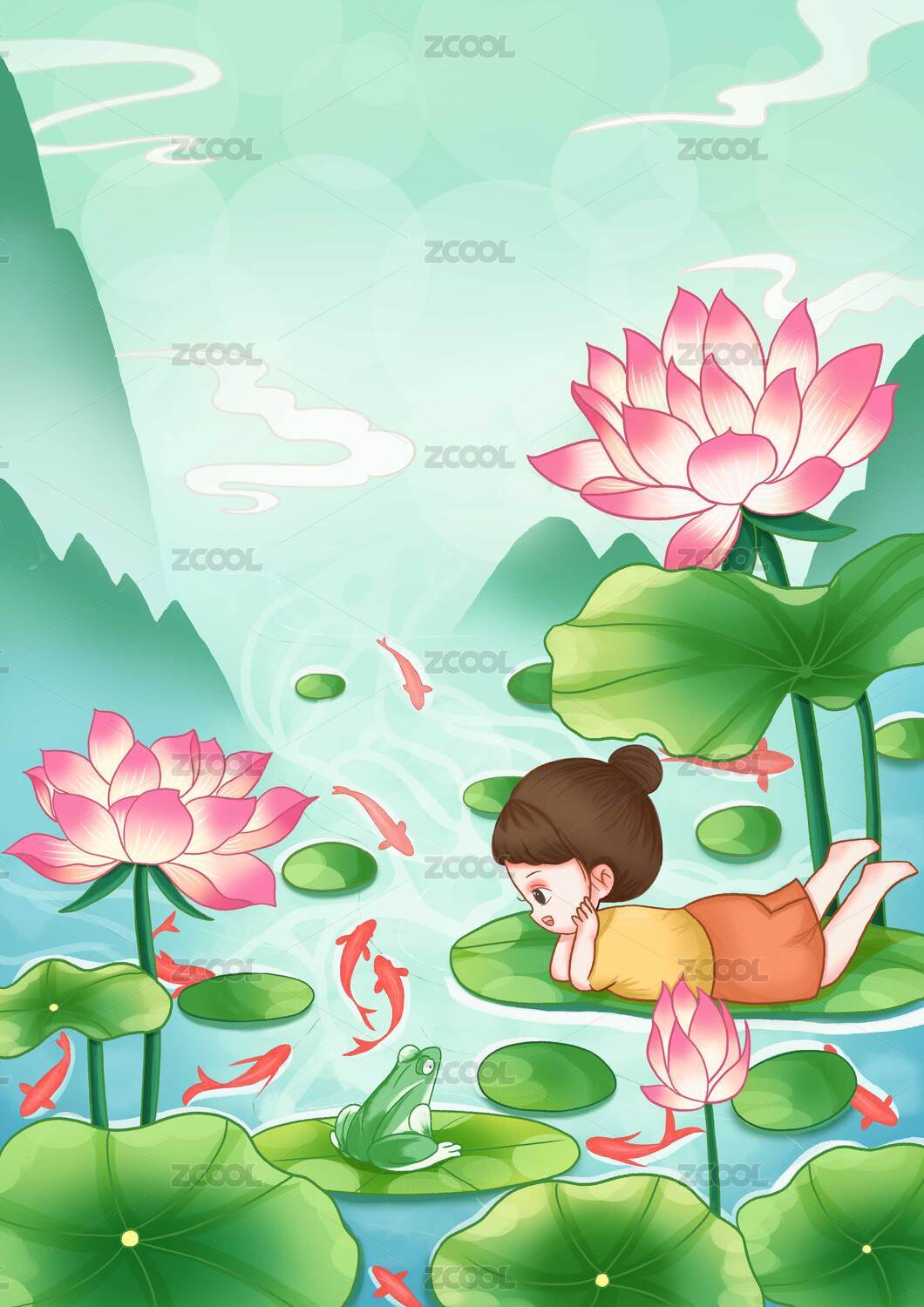 夏天女孩和猫荷花荷叶卡通手绘插画海报