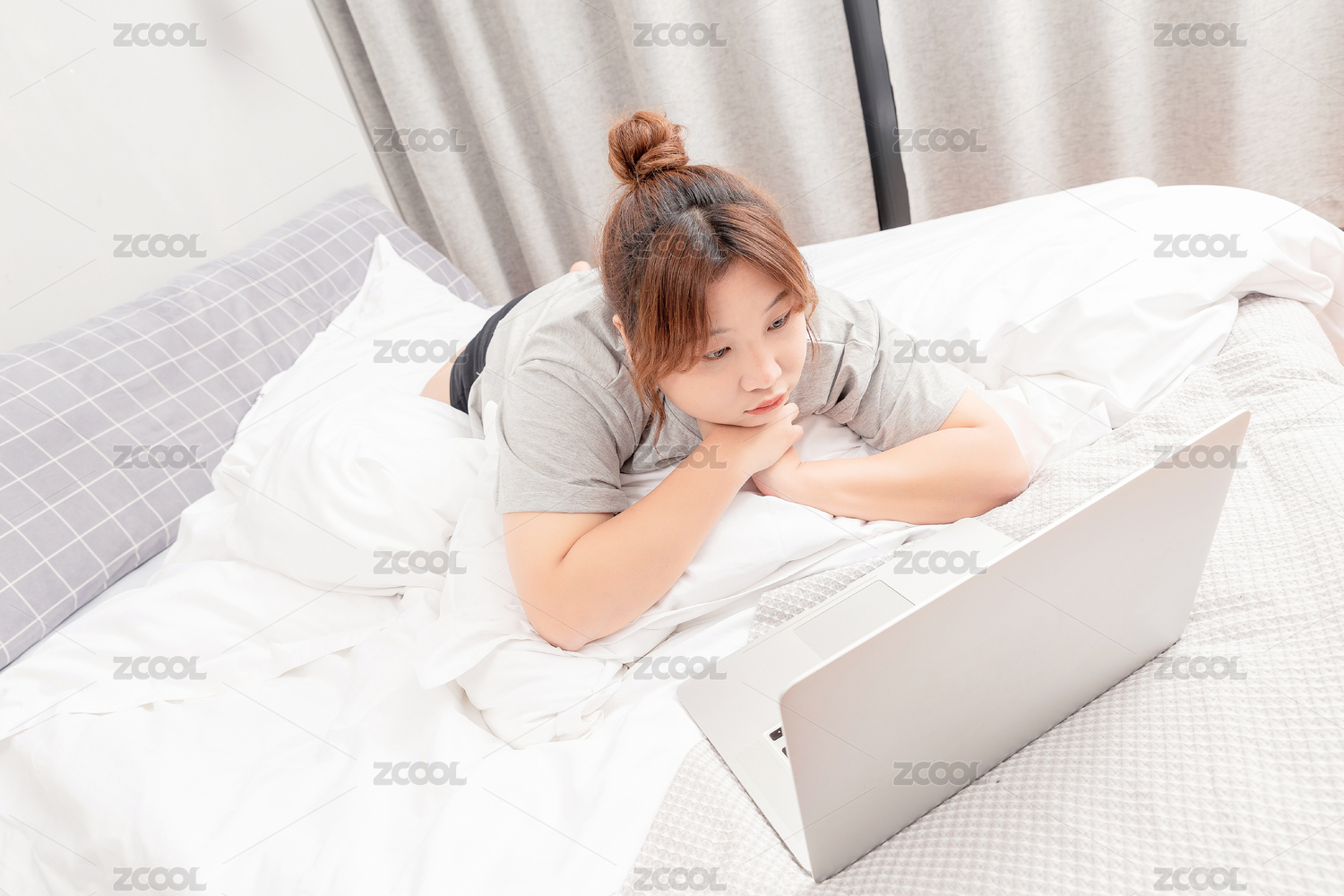 躺在床上的边喝咖啡边看电脑的亚洲女孩