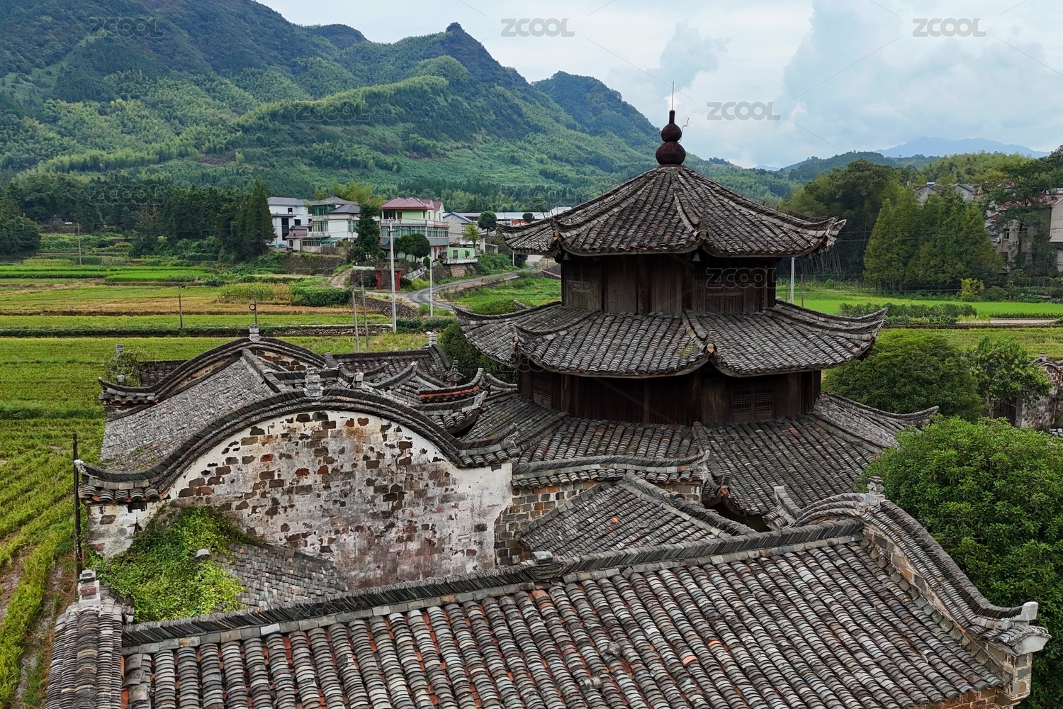 中国福建龙岩长汀县彭坊村一幢木制古建筑及周边的房屋与山峦