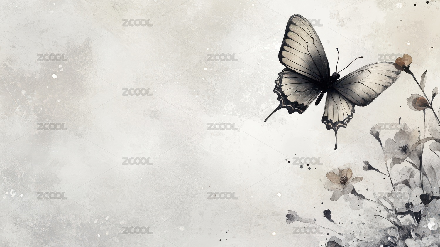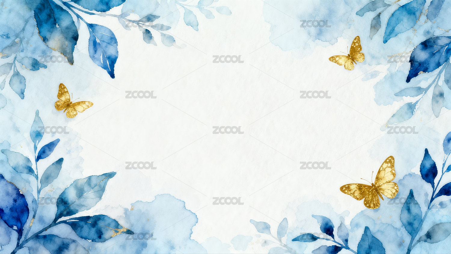 蓝色水彩树叶与金色蝴蝶装饰背景