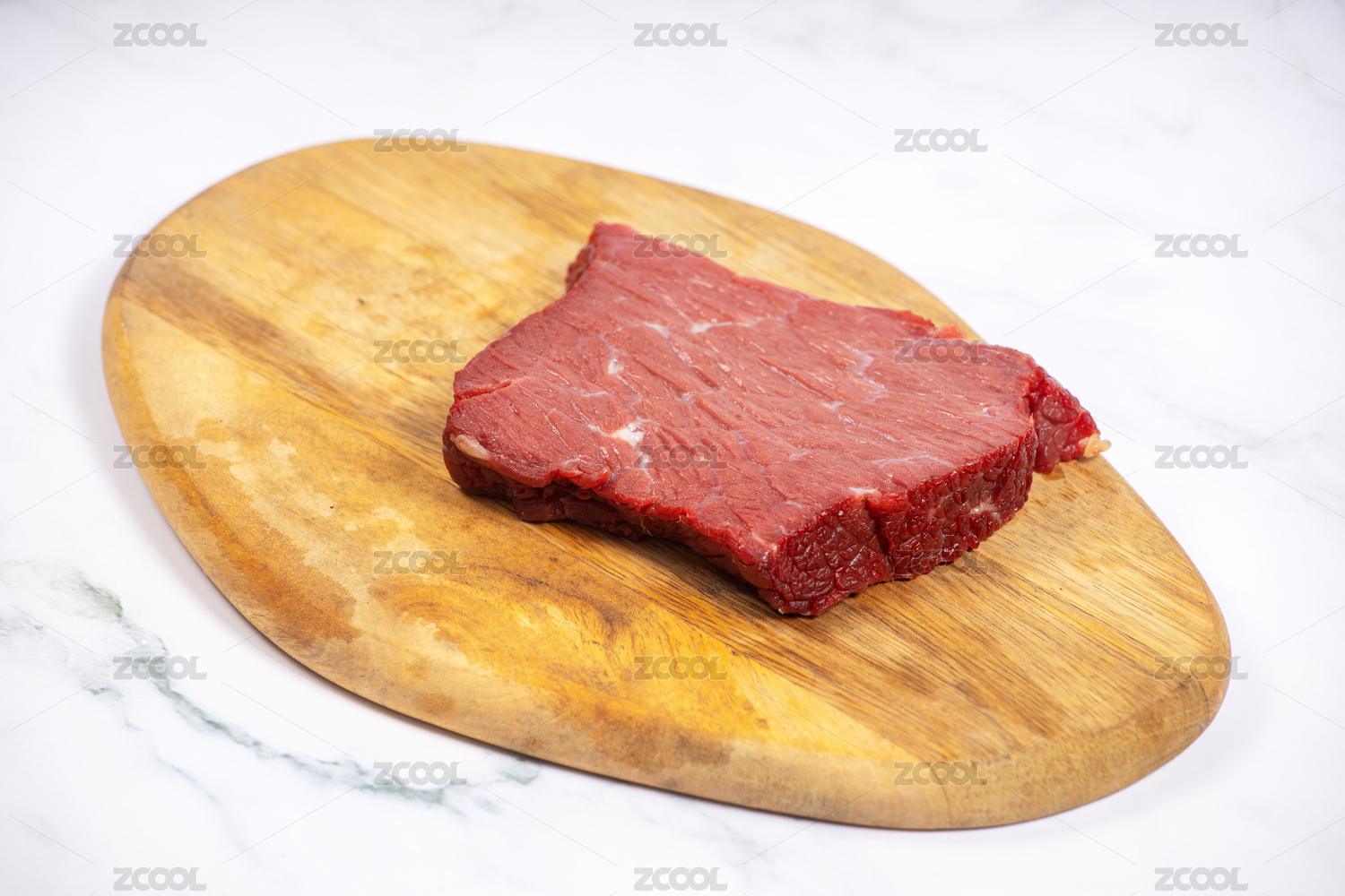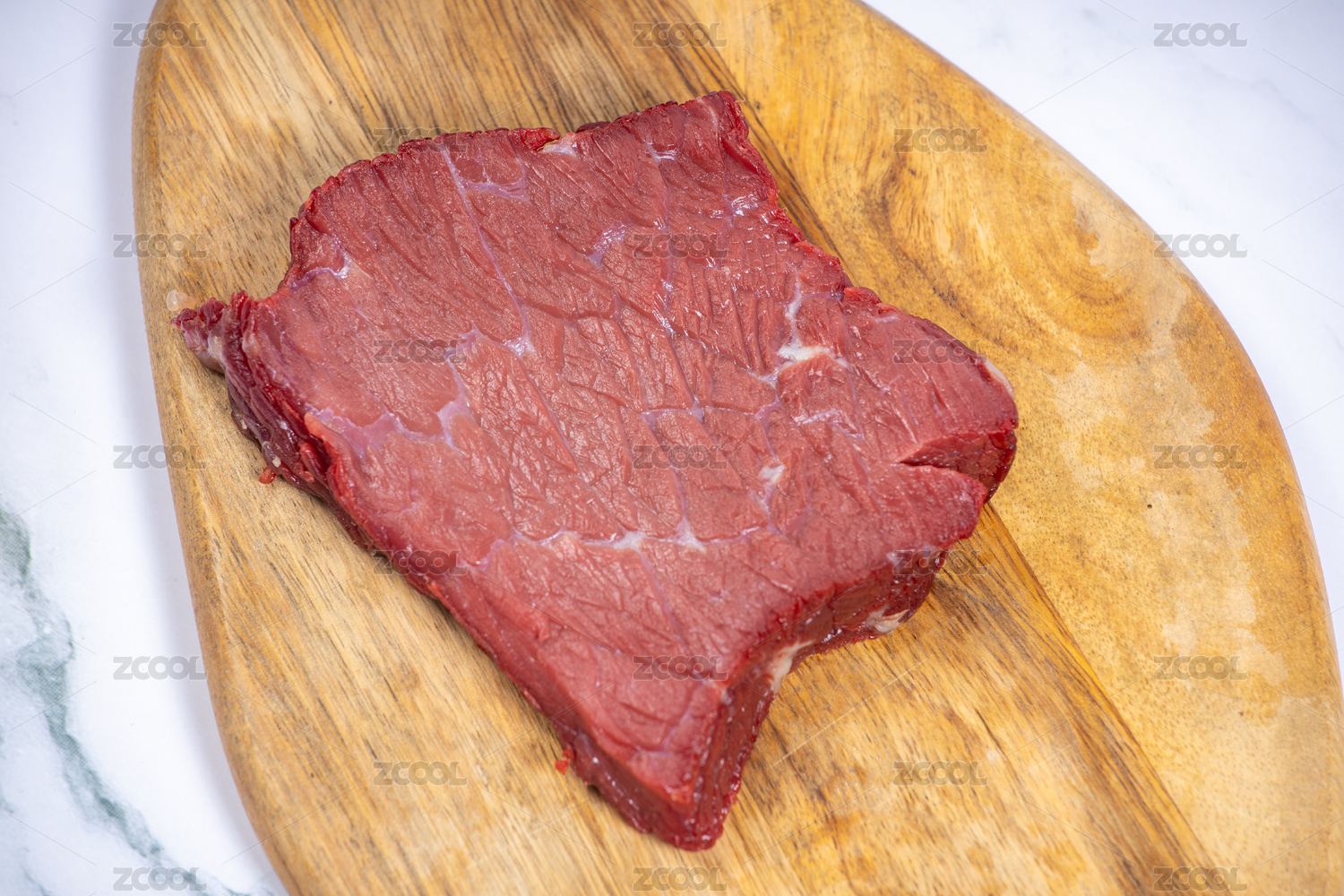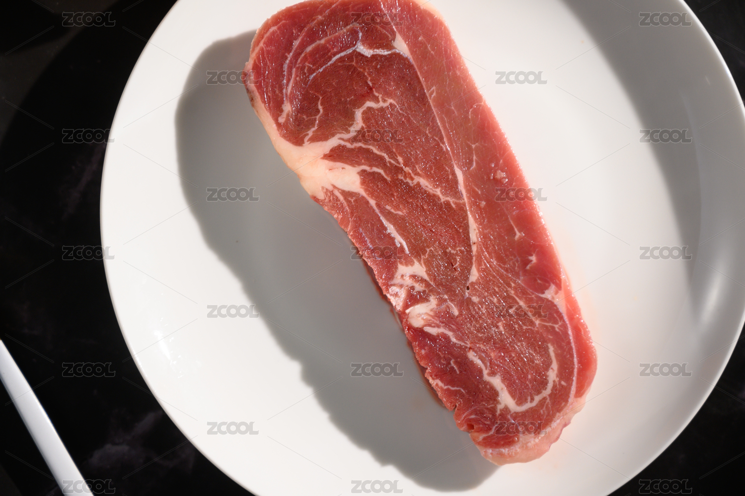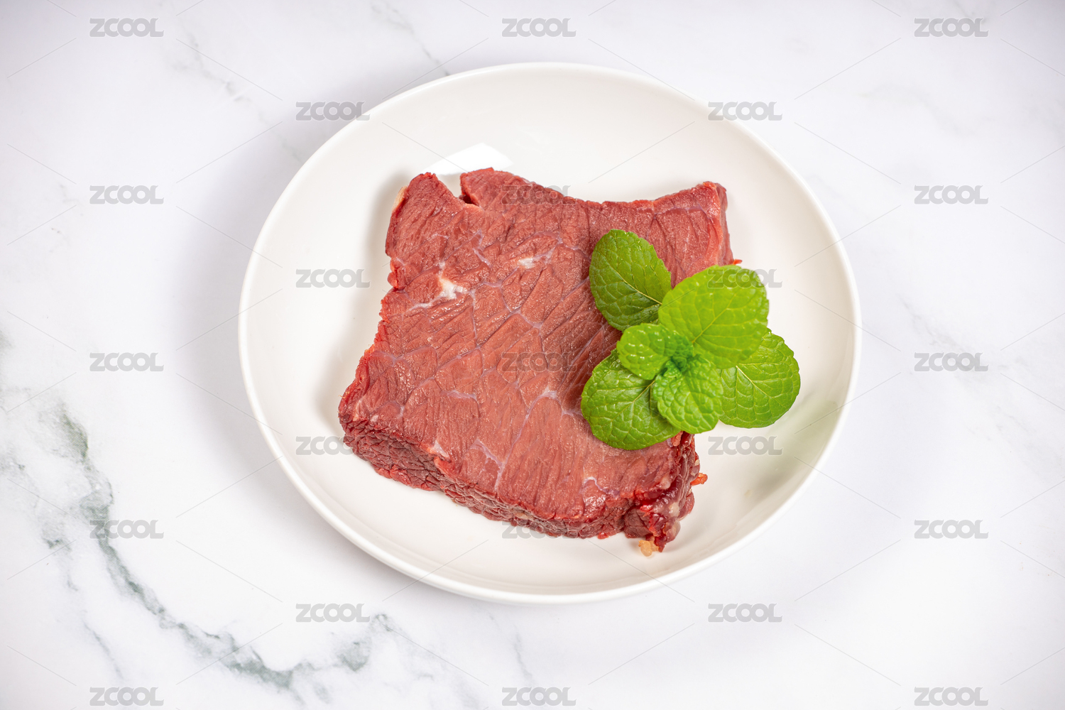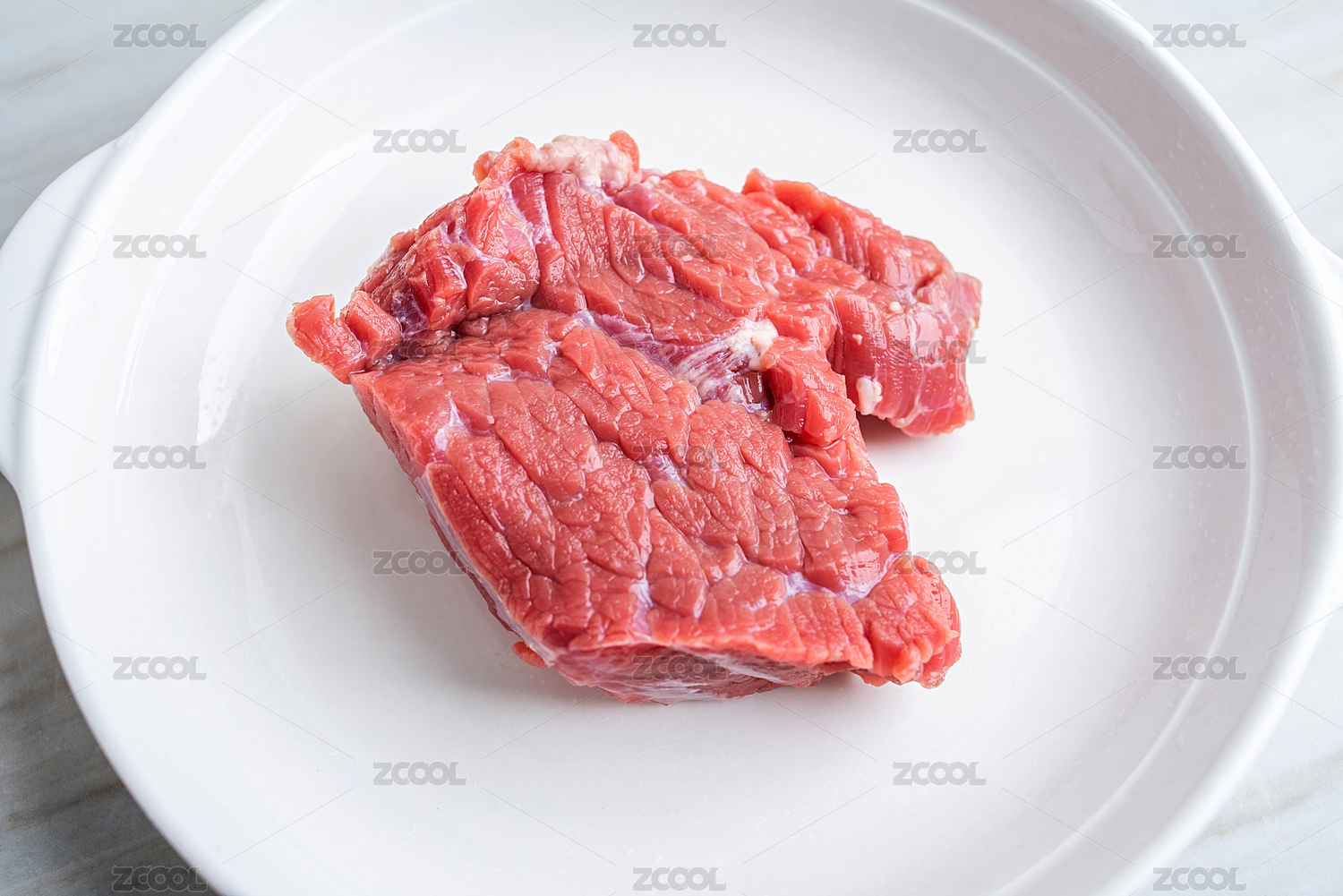厨房瓷砖台面碟子上一块新鲜黄牛肉