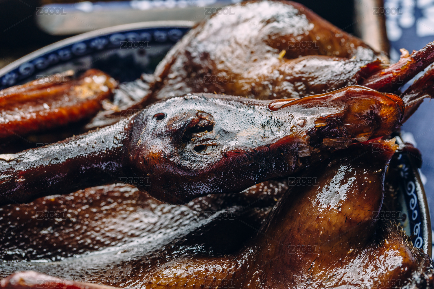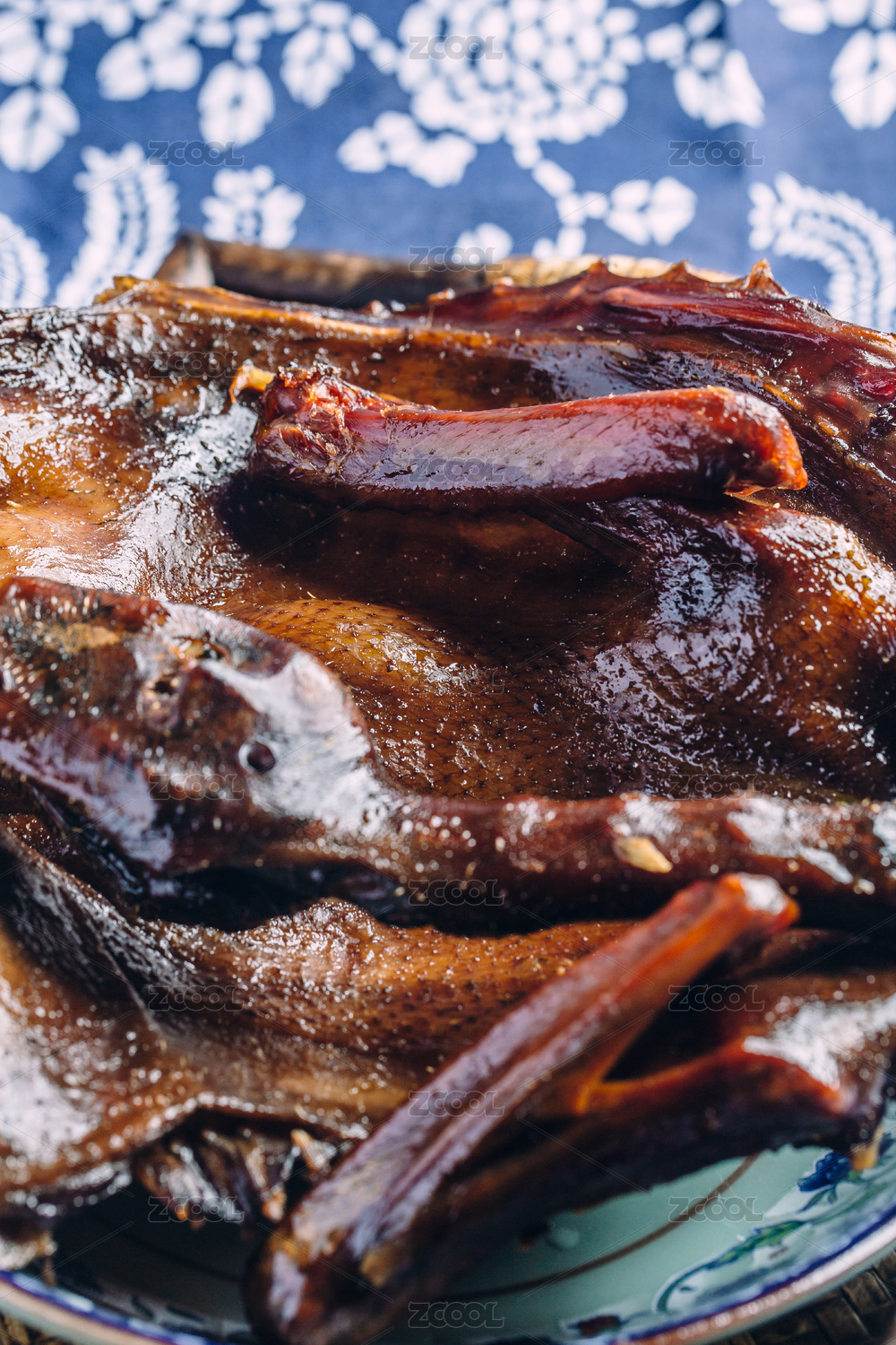 蓝色中式背景布下的酱板鸭