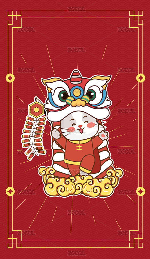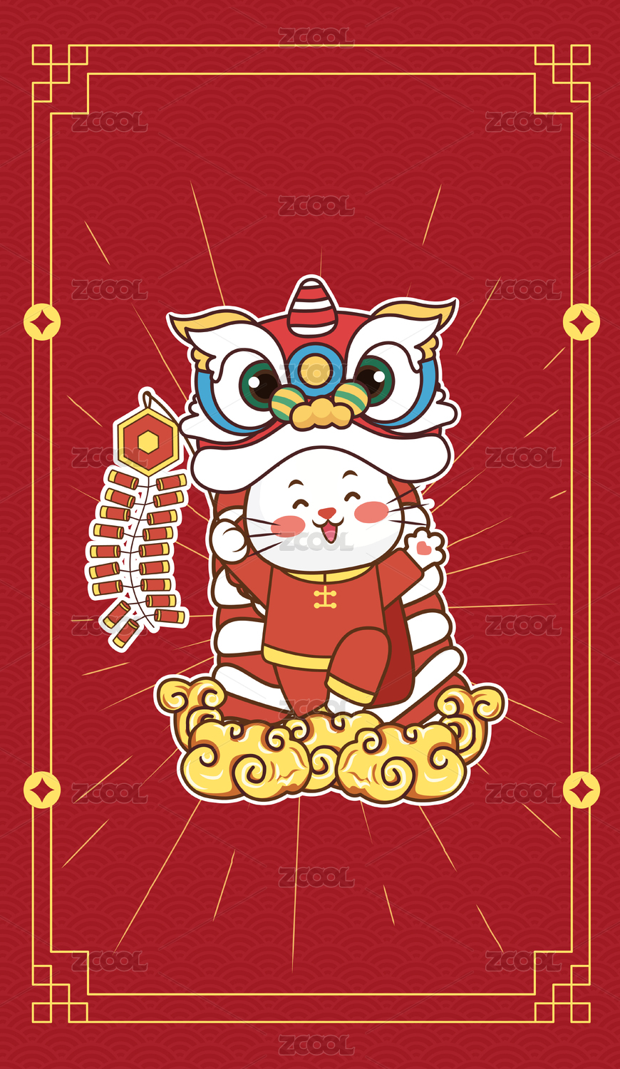 原创矢量中国风国潮插画喜庆鼠年老鼠舞狮壁纸