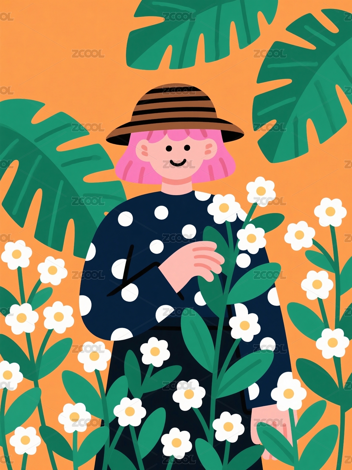 扁平插画彩色花朵女生矢量风格浪漫花束女孩