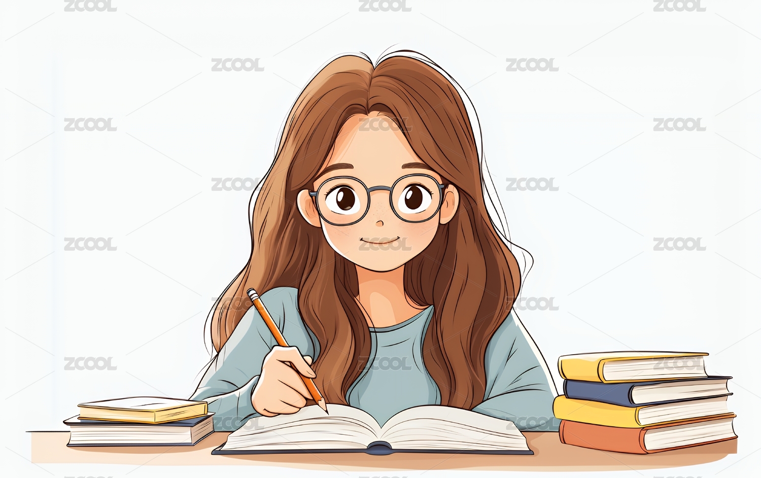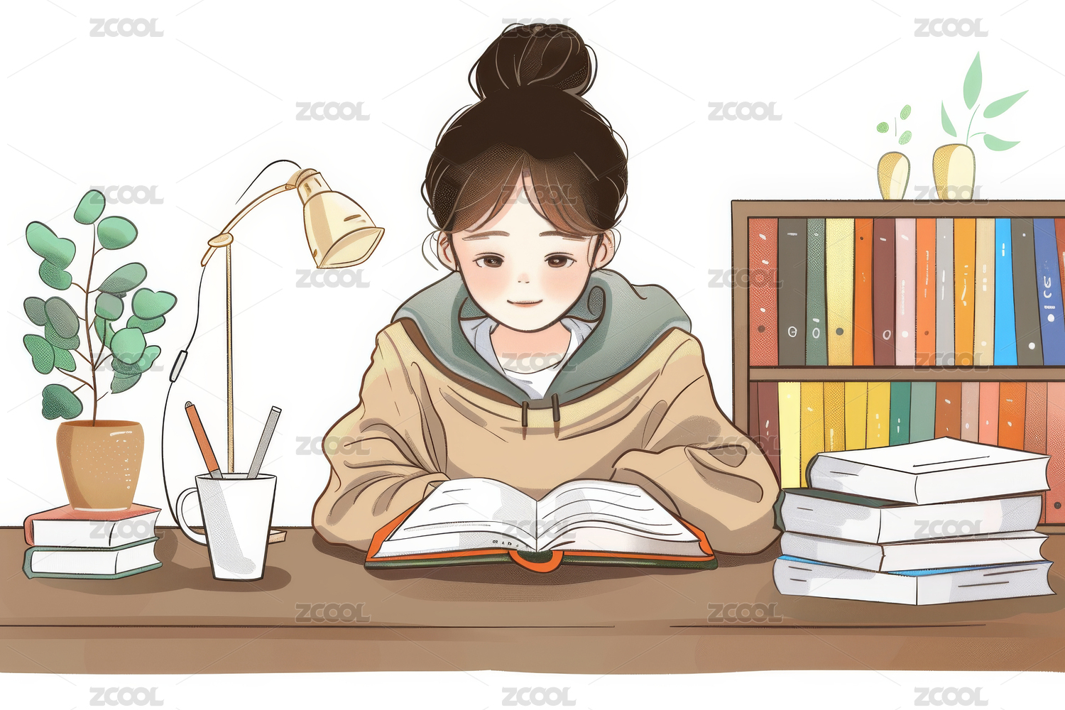 卡通,线条画,看书,学习,插画,女孩,开心,阅读,写作,打字