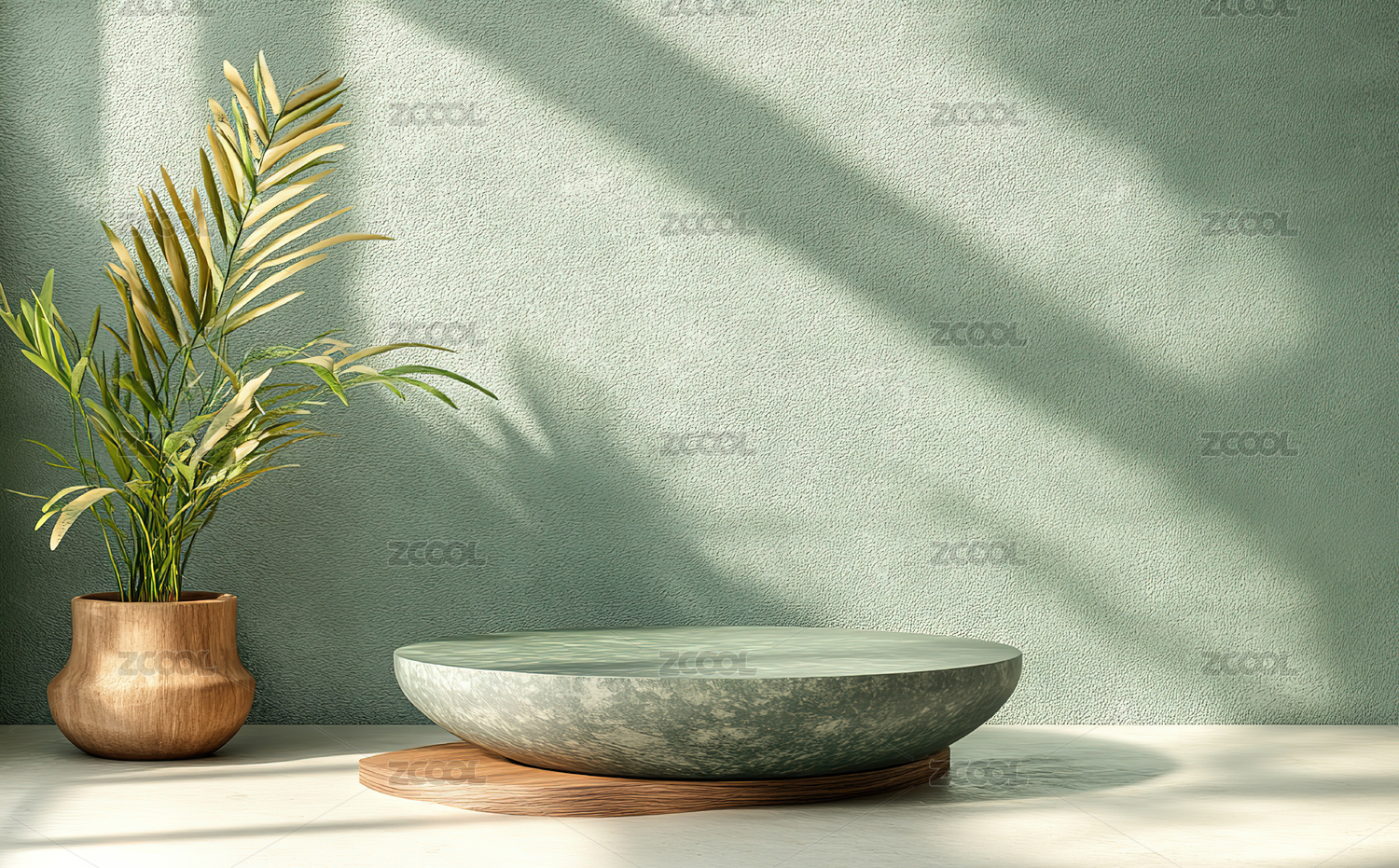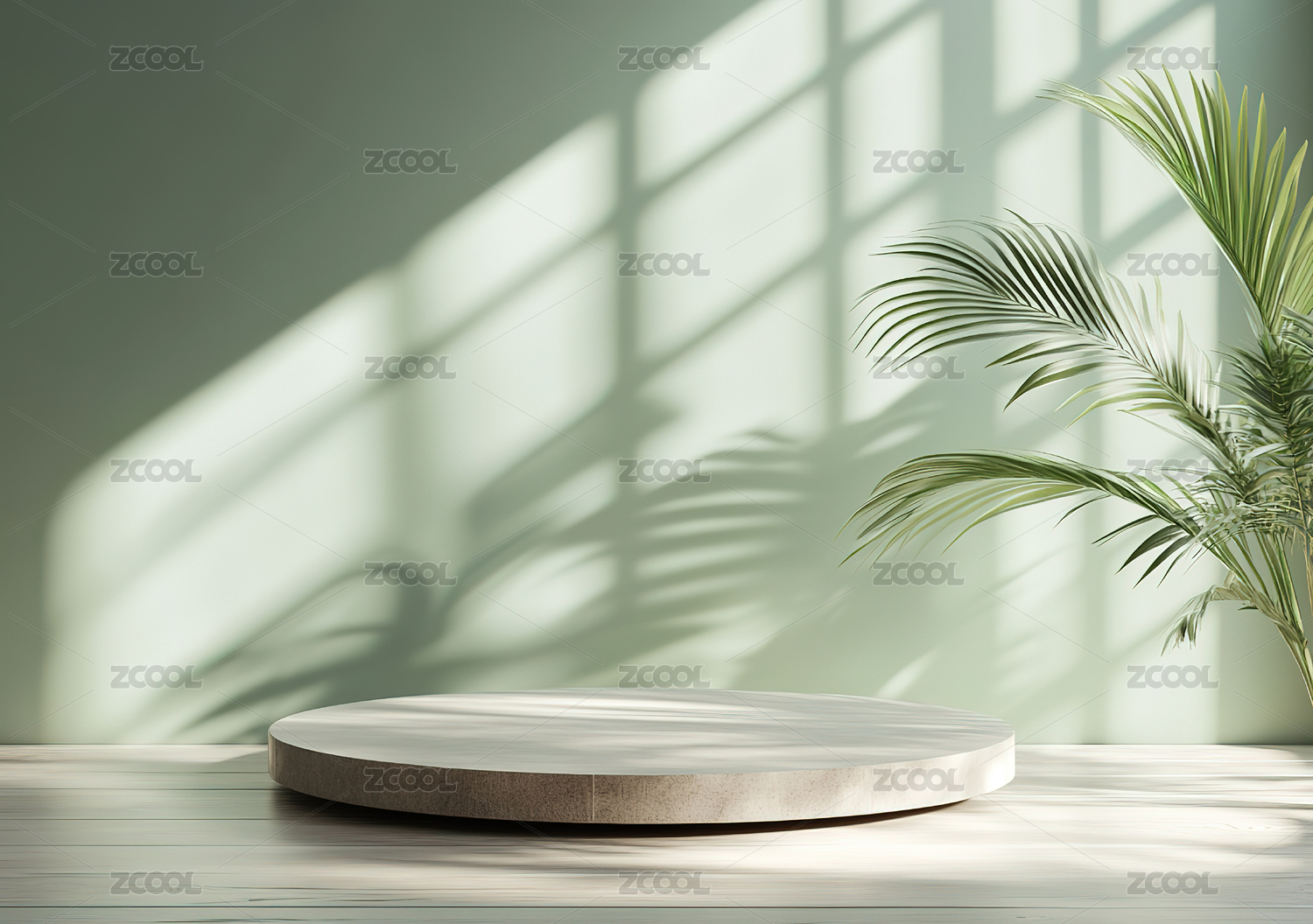 简约绿色背景中的3D圆形木质展台