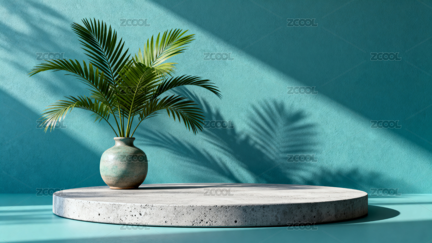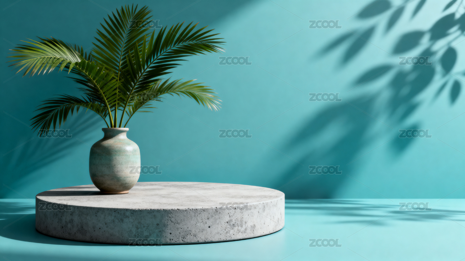 蓝色背景下的水泥台与绿植