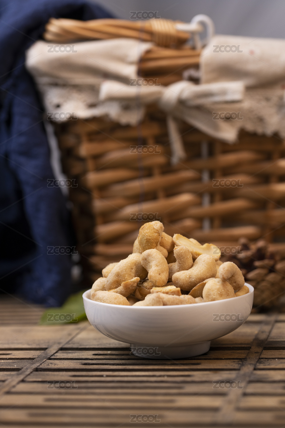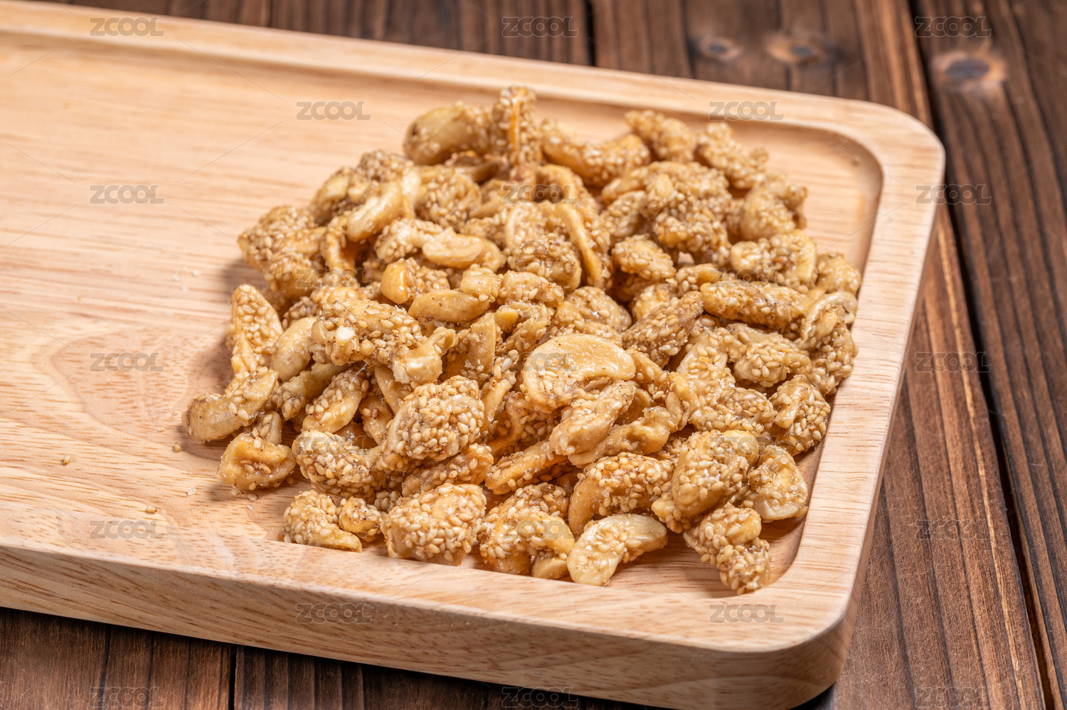 木纹桌上托盘里的芝麻腰果