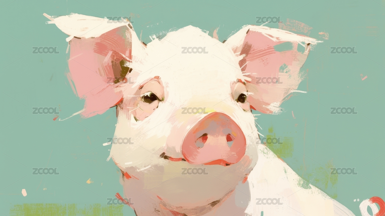 白天晴朗树丛草地的猪肥猪特写插画绘画手绘
