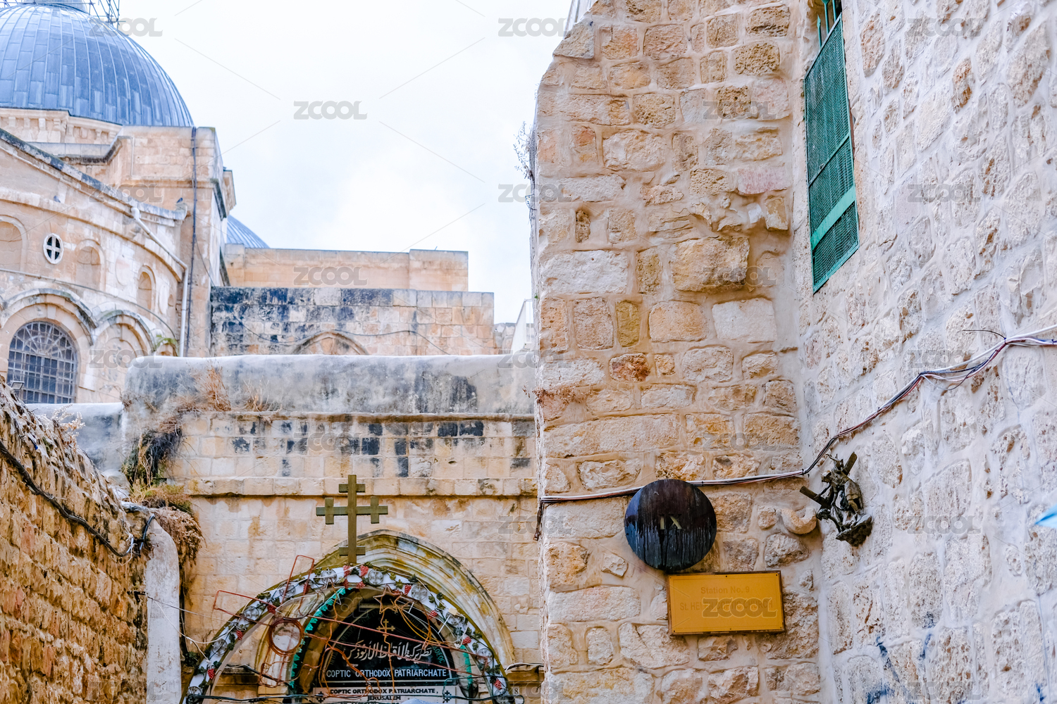 以色列耶路撒冷圣墓教堂的窗户与梯子