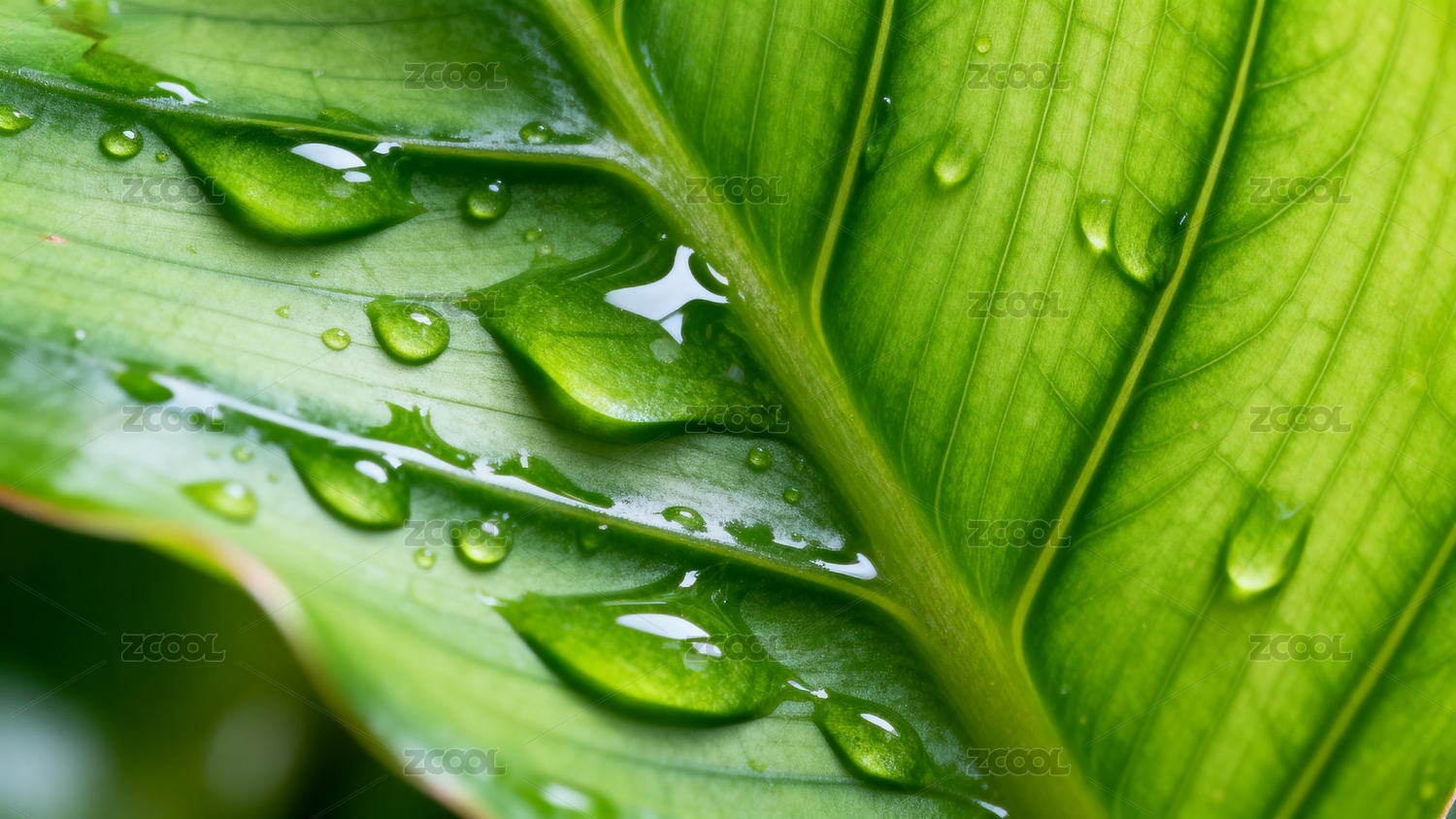 下雨天绿叶上的水珠微距特写