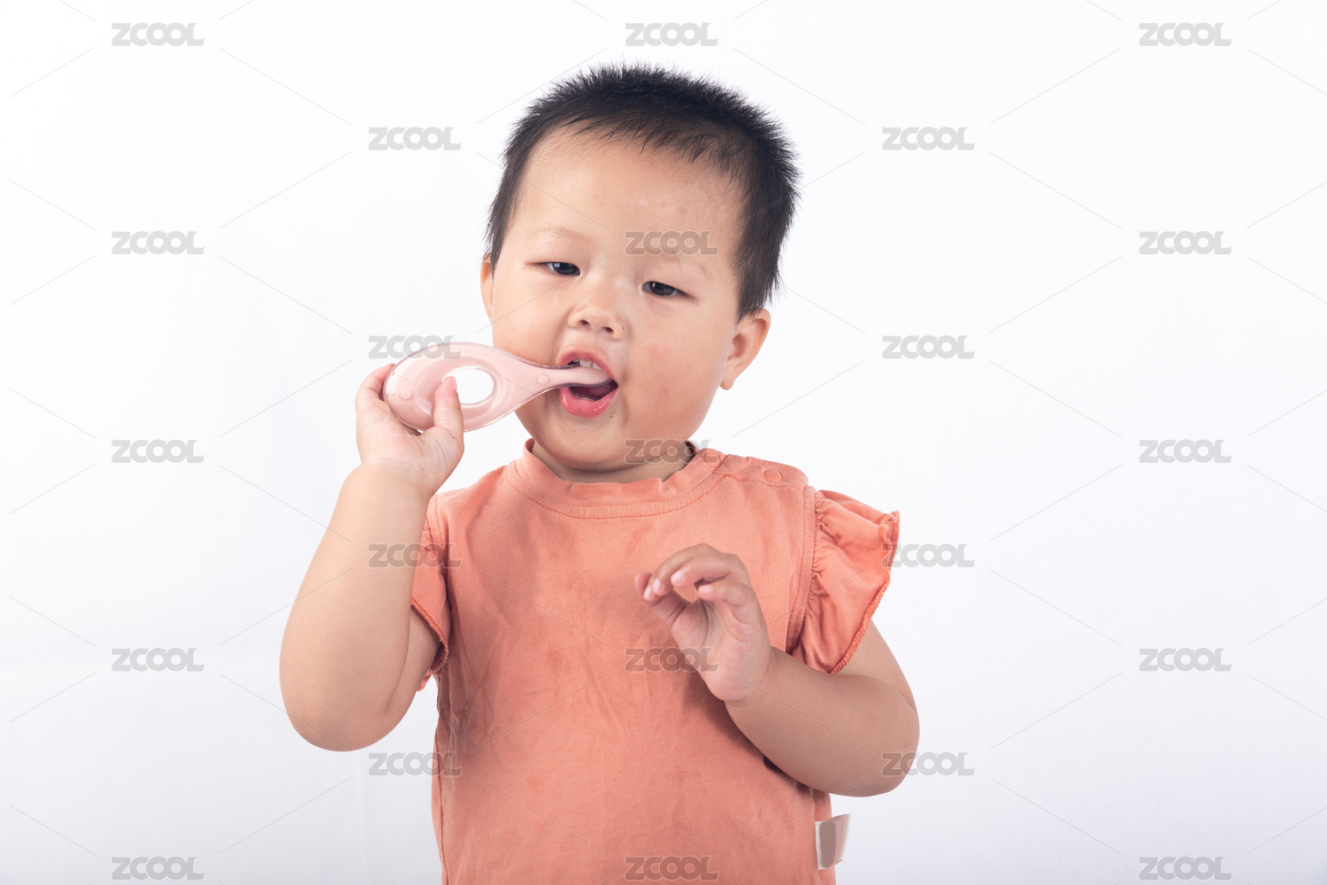 白色背景前自己刷牙的幼童