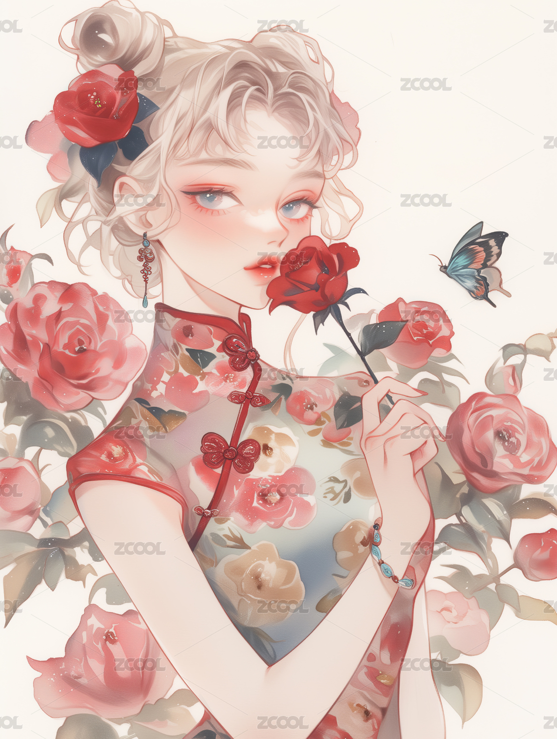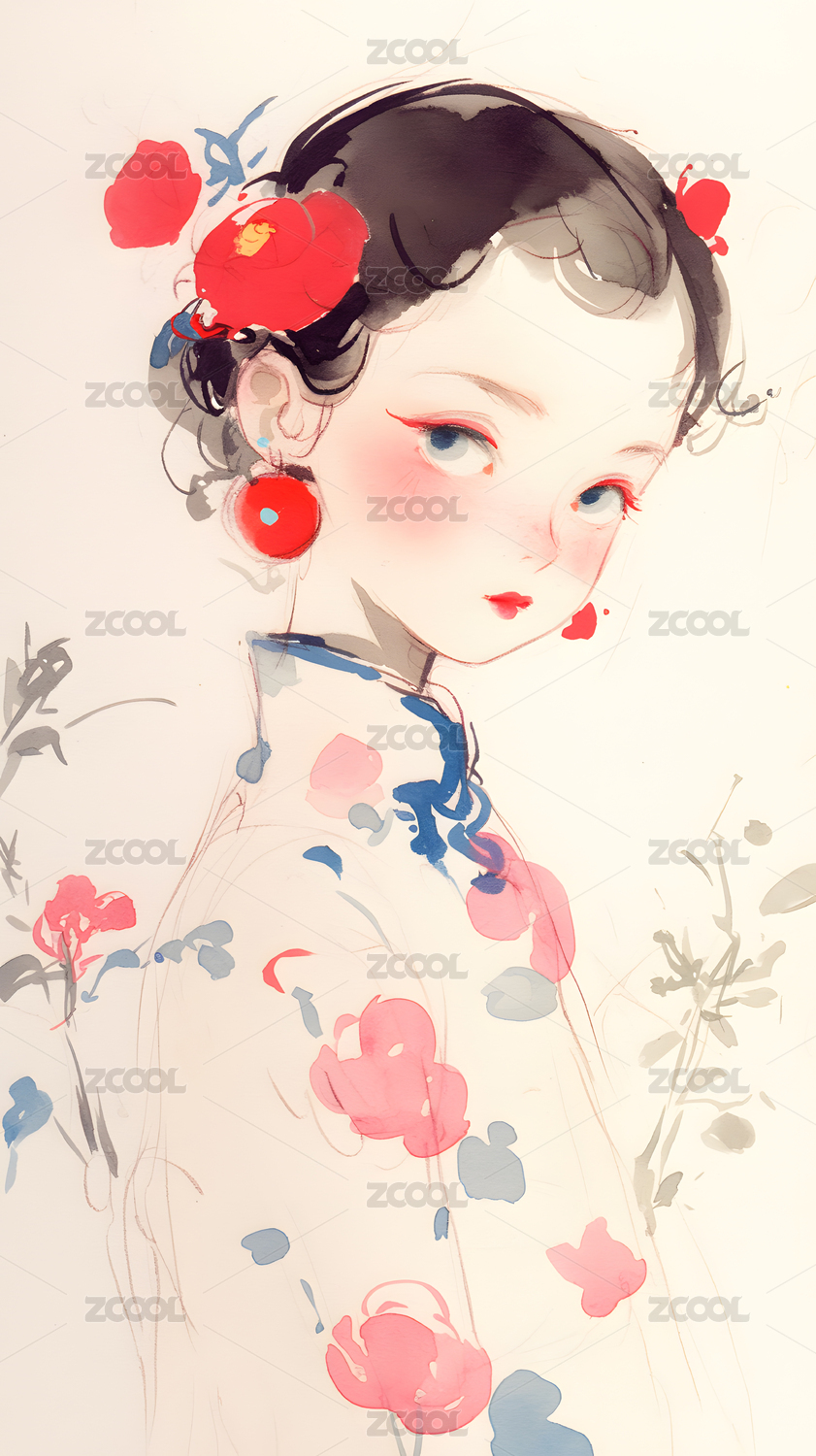 一位穿着旗袍的女性在喝茶国风水彩插画