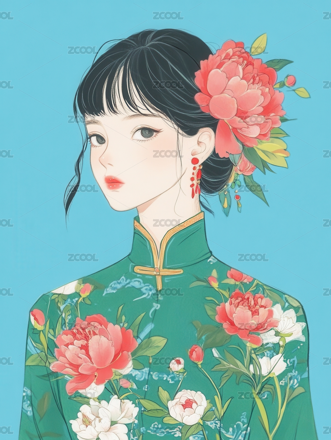 身穿橙色旗袍的少女在牡丹花中亭亭玉立