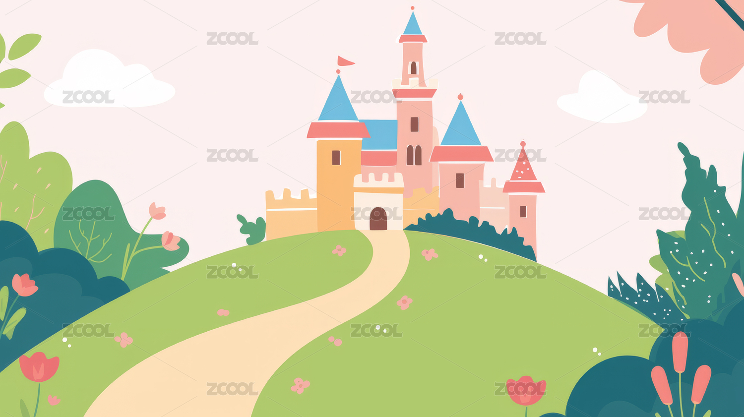 蓝天白云下绿色草地上的欧式卡通城堡