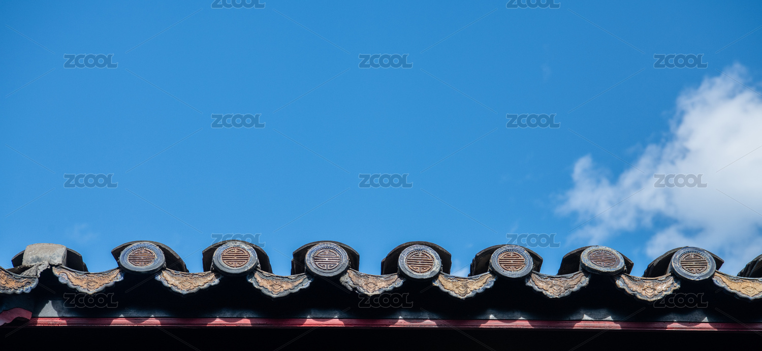 中国云南省丽江市,蔚蓝天空下古城楼角