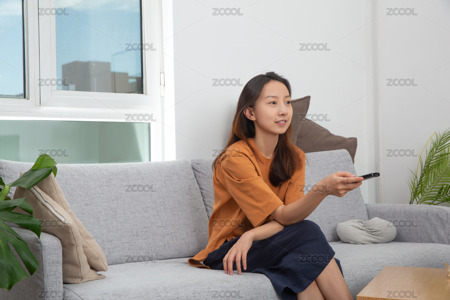 坐在客厅沙发上看电视的年轻女人面带笑容