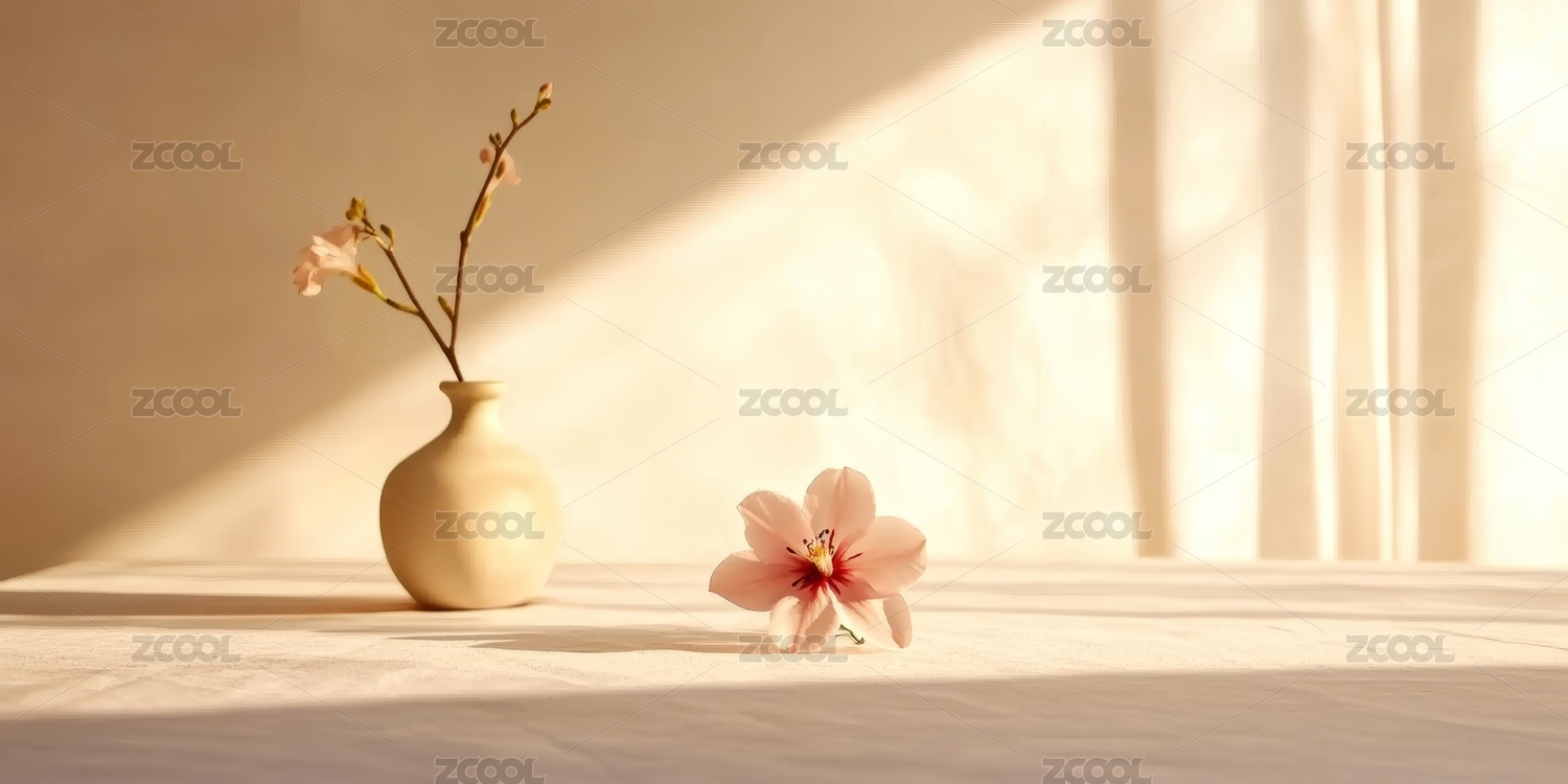 简约风格,浅棕色,石质讲台,不规则形状,米色背景,白色花朵,玻璃瓶,自然之美,产品展示,产品展示背景