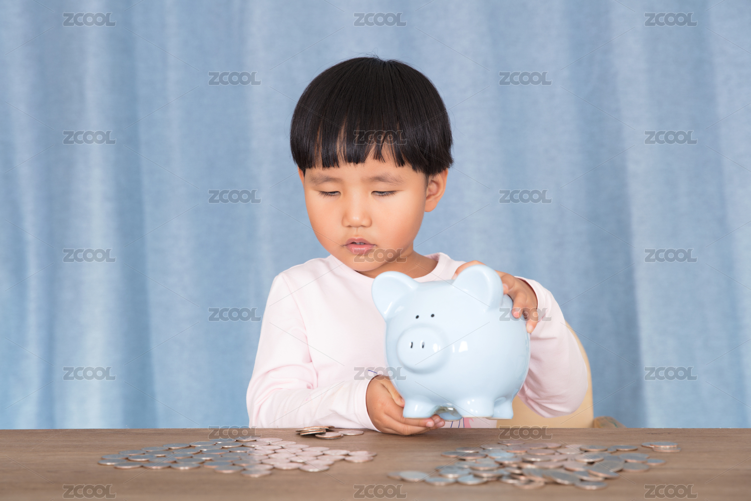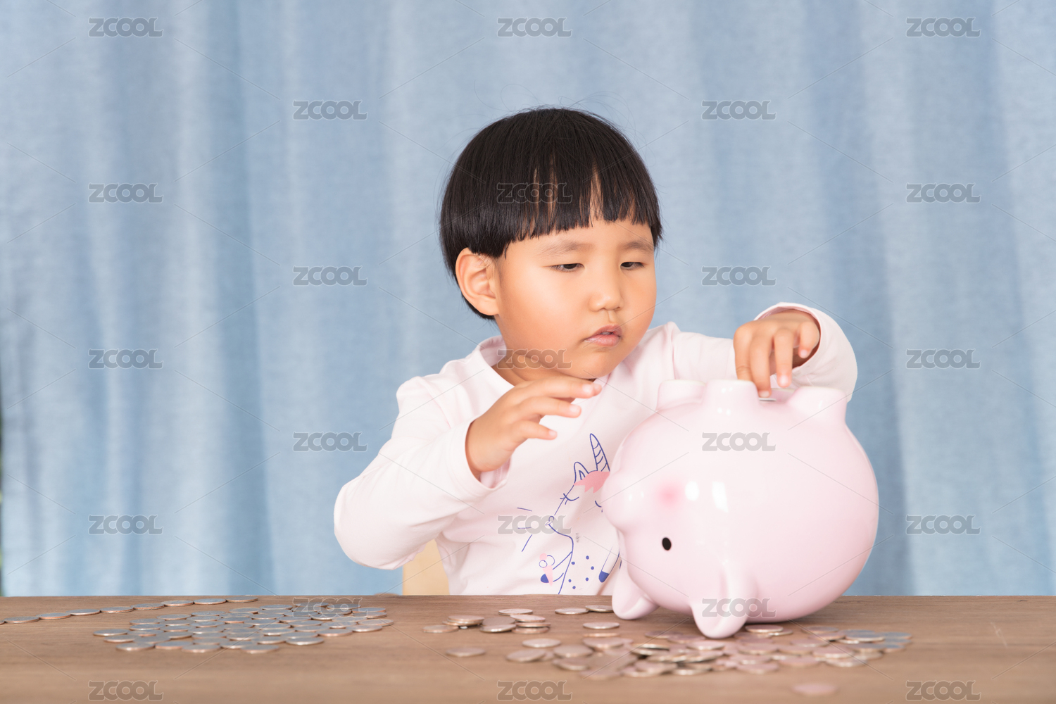 中国小女孩手捧存钱罐看着桌子上的零用钱
