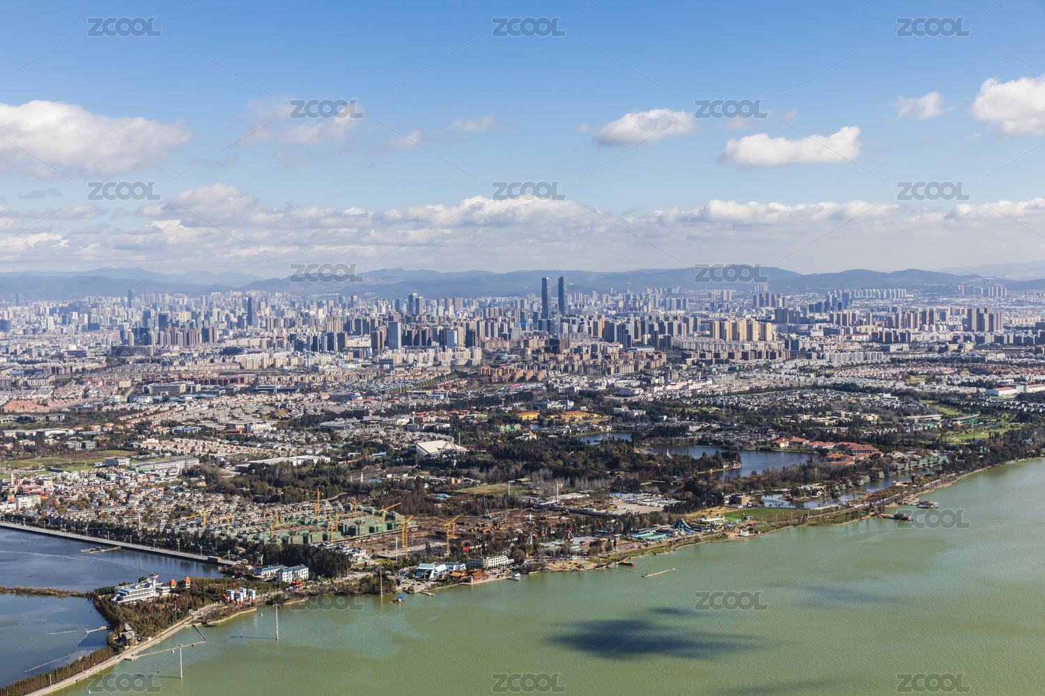 远眺滇池湖畔的中国云南省昆明市城市建筑群
