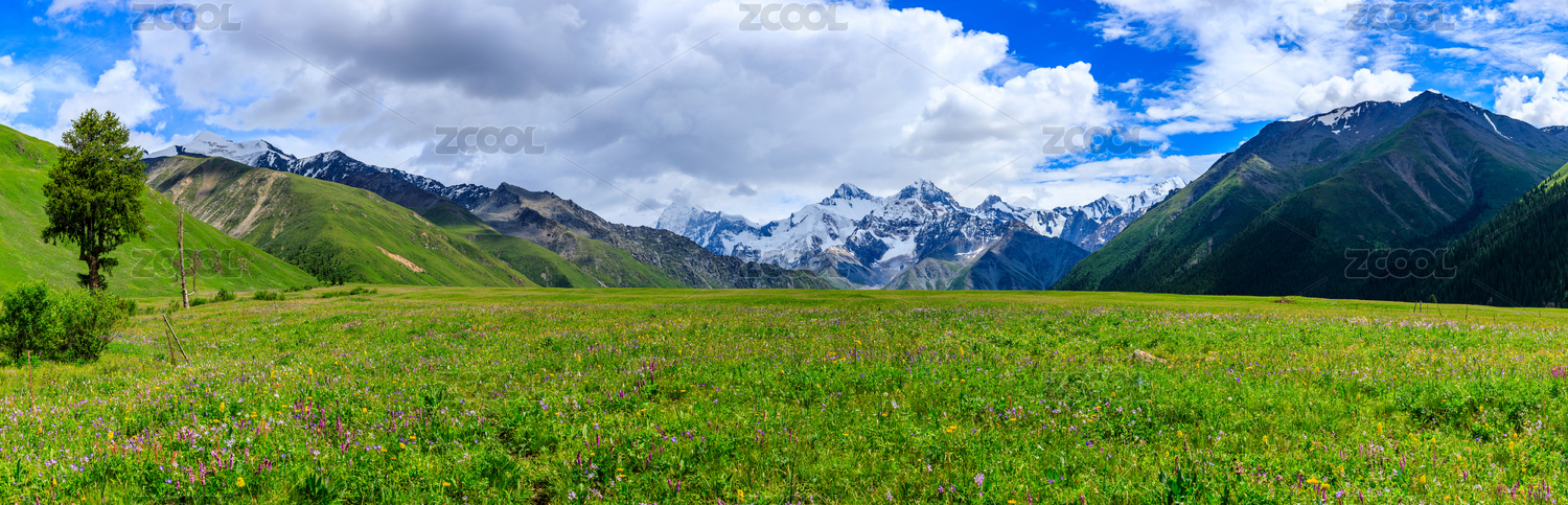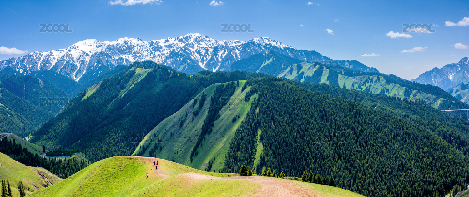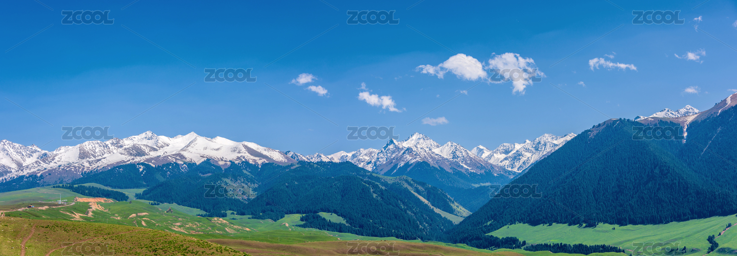 中国新疆下塔风景区雄伟的山脉和绿色的草原