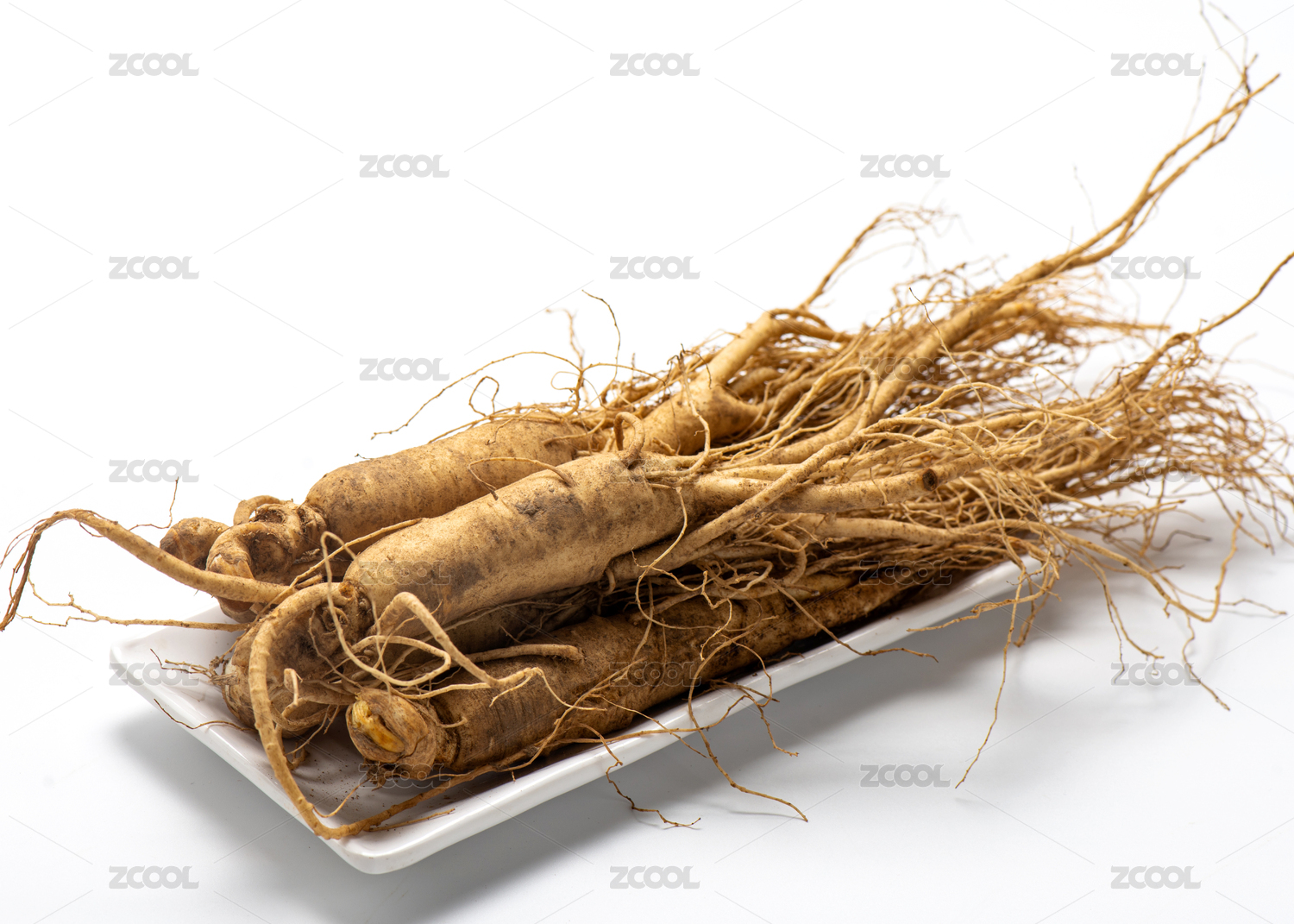 白色背景上摆放的长白山新鲜人参