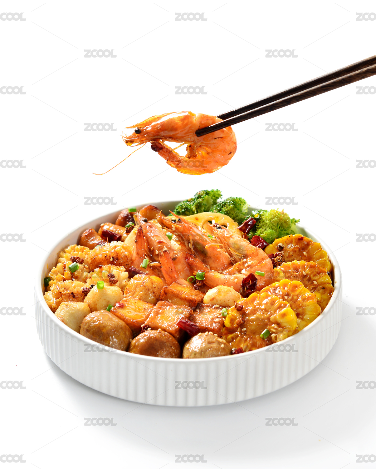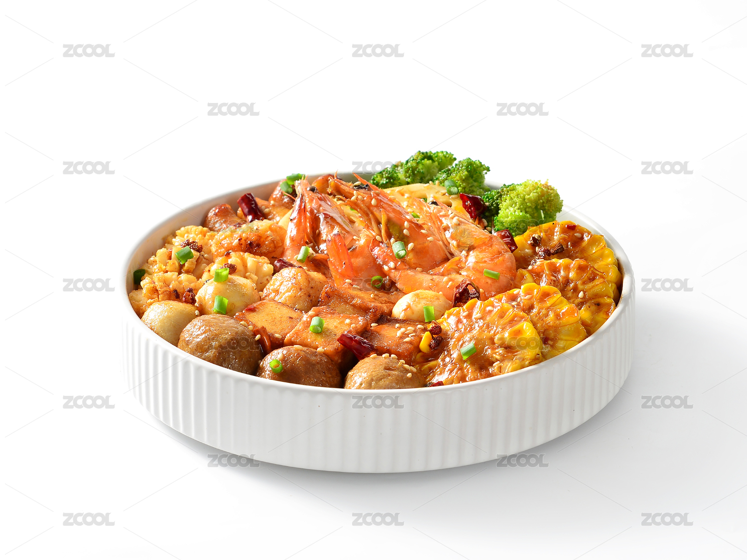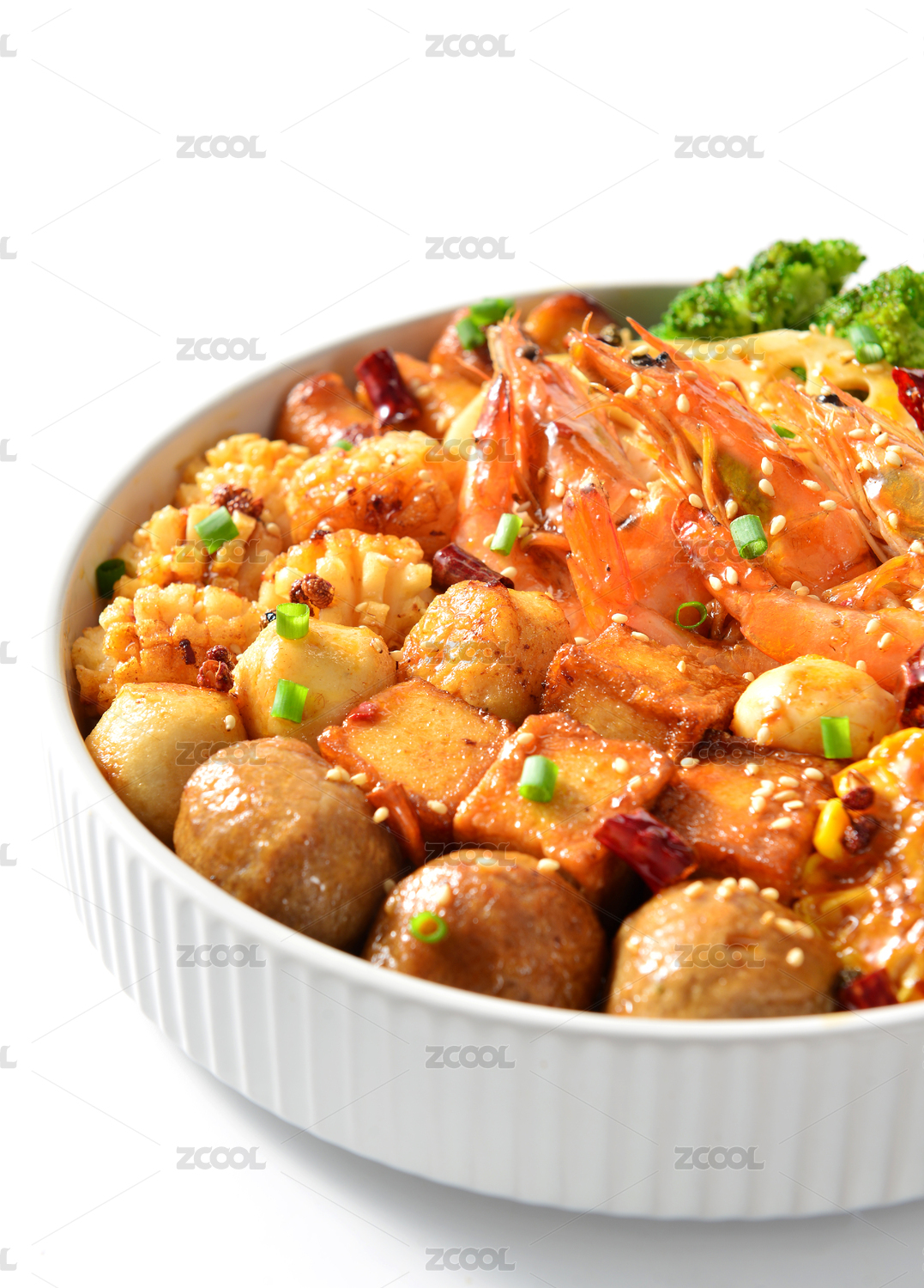 麻辣香锅,干锅冒菜,冒菜,红油冒菜,北极虾,西蓝花,鹌鹑蛋,鱿鱼花,海鲜,麻辣