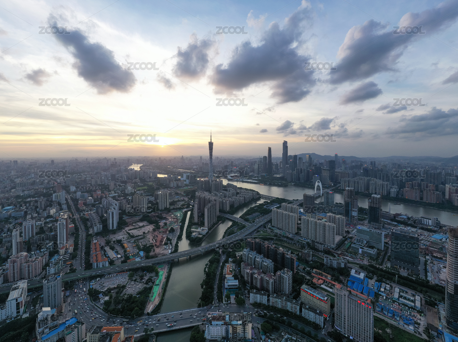 中国广东广州,航拍日出时的珠江及两岸景观