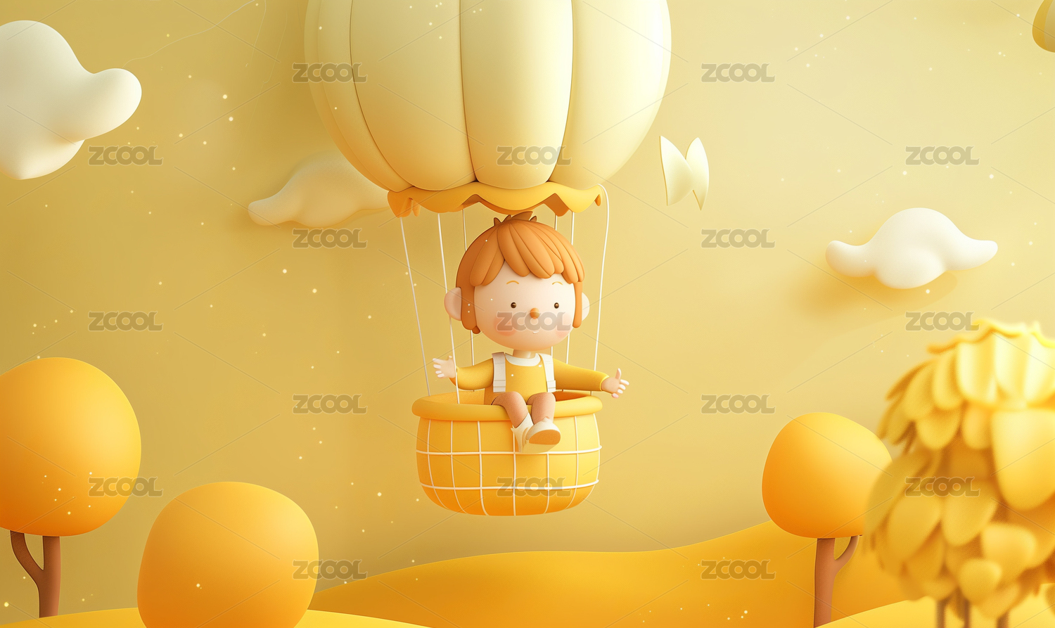 儿童节插画,天空中的太阳、小女孩和泰迪熊