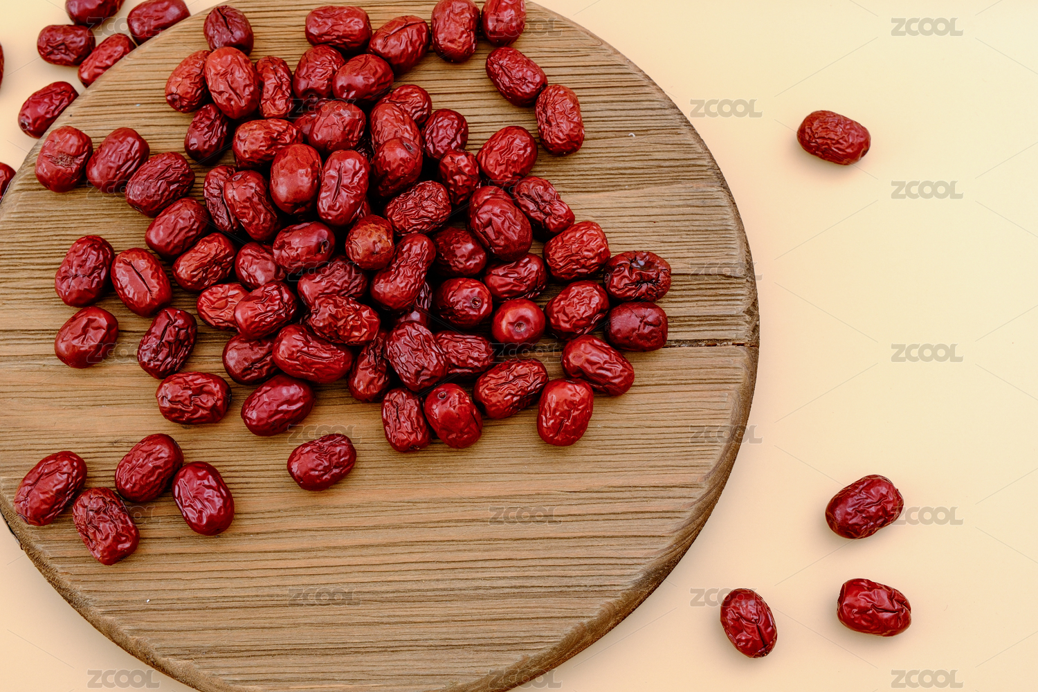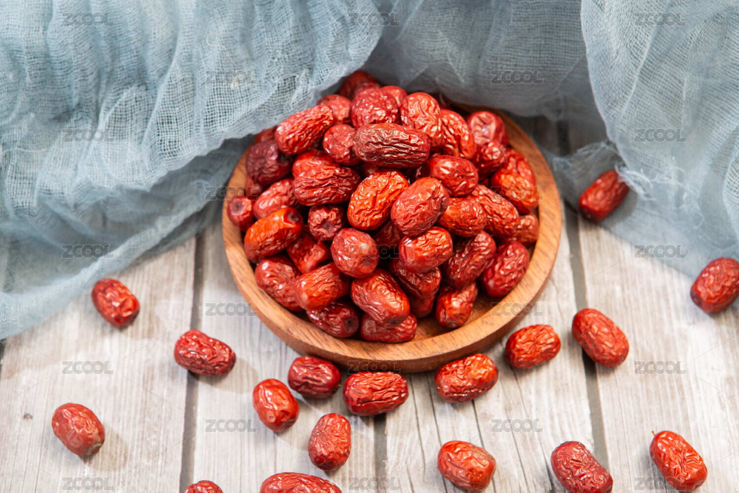 一堆红色干枣在白色斑驳的木桌子上还有木盘子