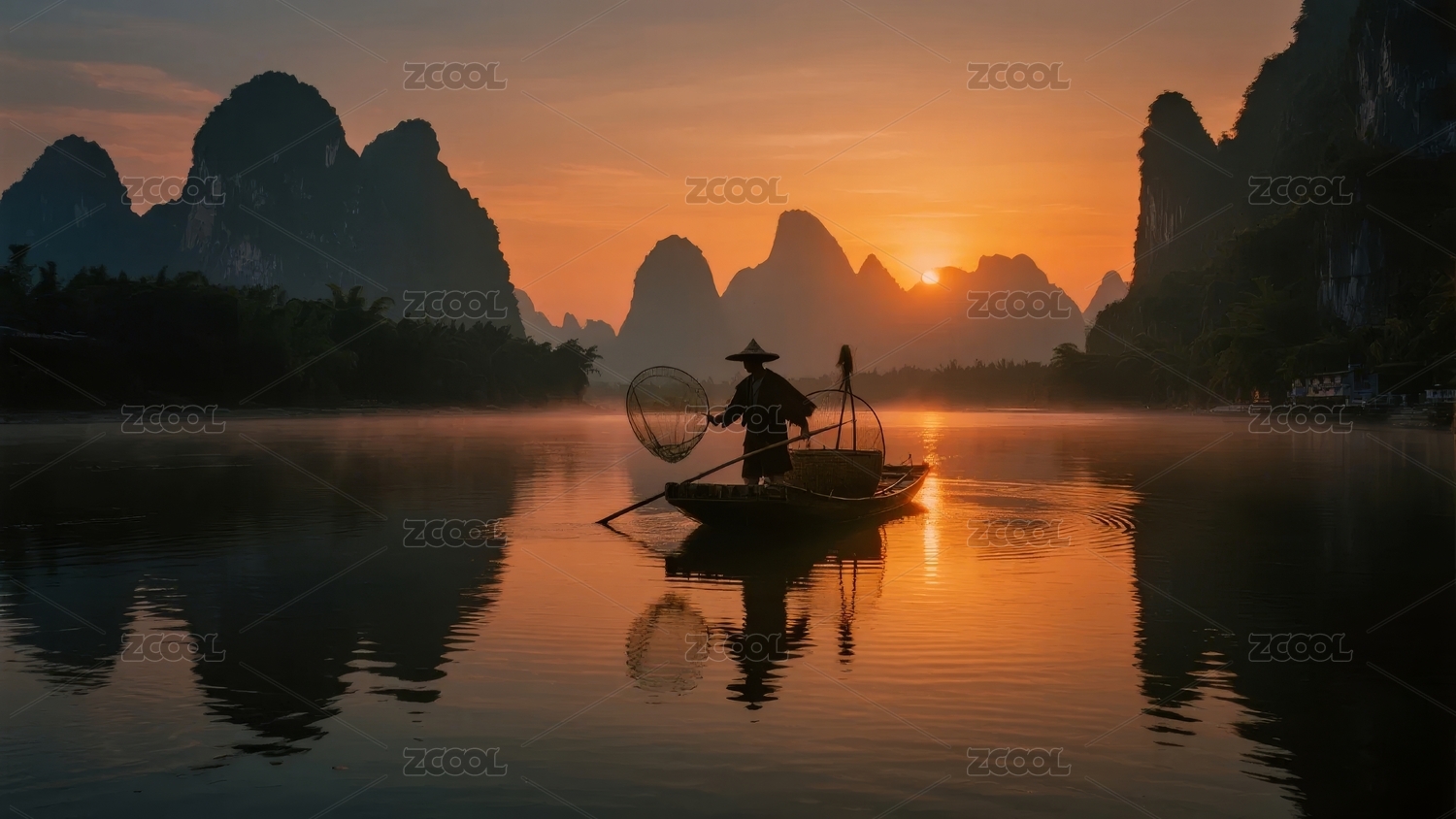 紫色,橙色,红色,光影,美丽,夕阳,山峰,自然,小船,宁静