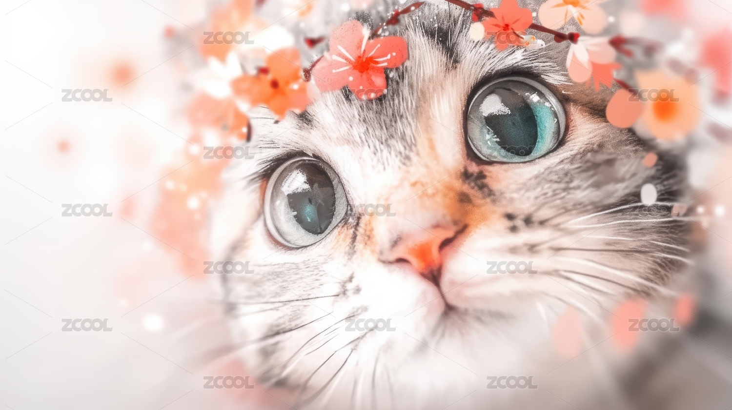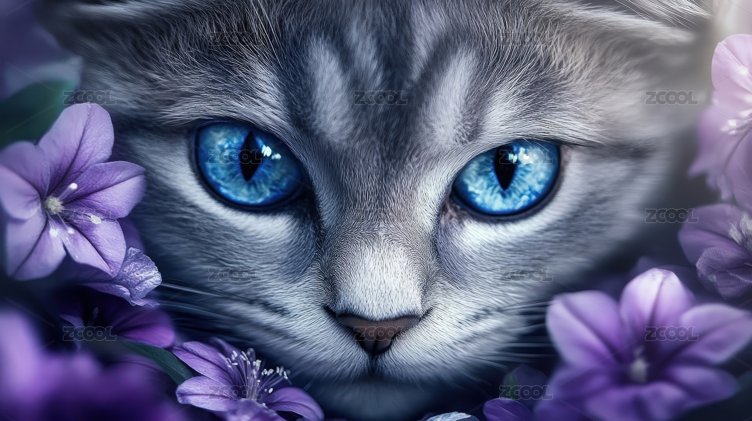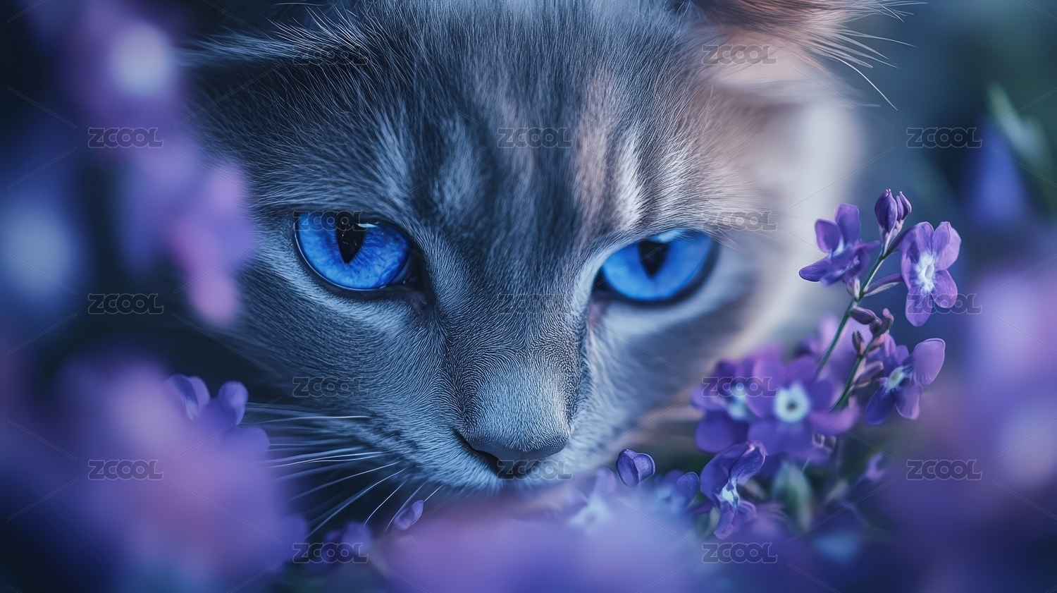 宁静,神秘,美丽,精致,优雅,猫咪,蓝眼睛,紫花,可爱,宠物