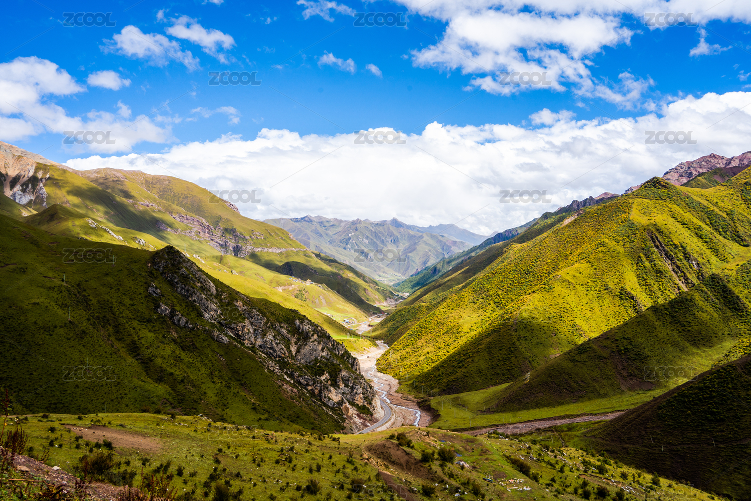 中国新疆夏季蓝天白云下G217独库公路沿途高山草原