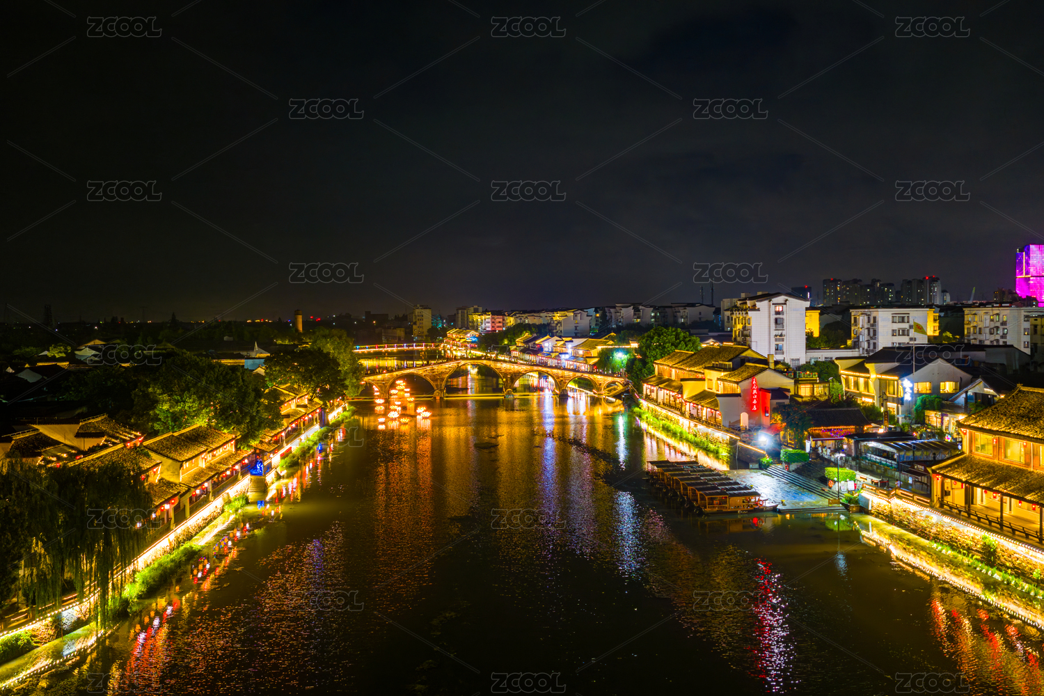 中国嘉兴桐乡乌镇西栅景区西市河上三孔桥安善桥夜景