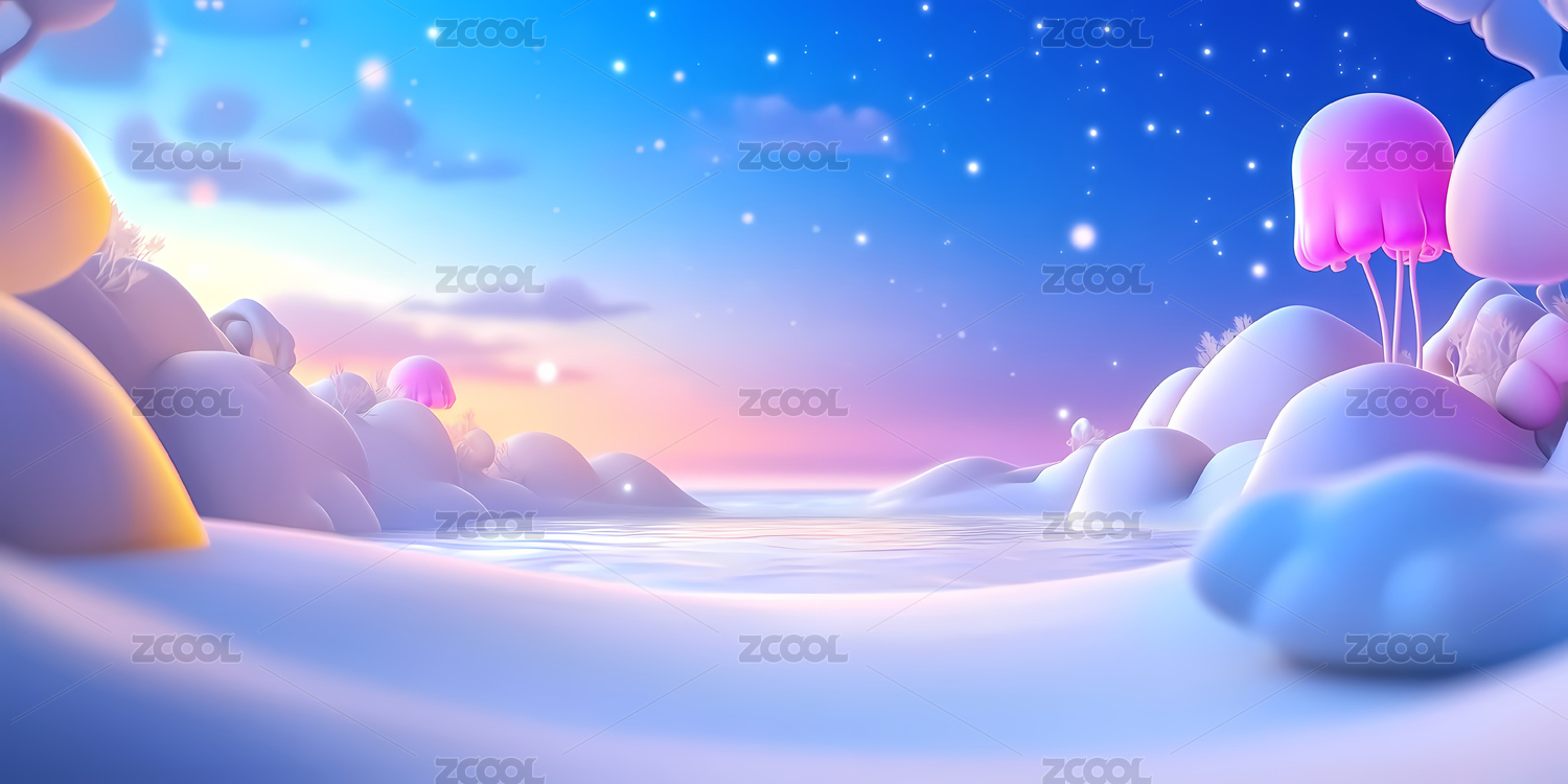 数码科技紫蓝色岛屿湖泊花朵插画海报背景