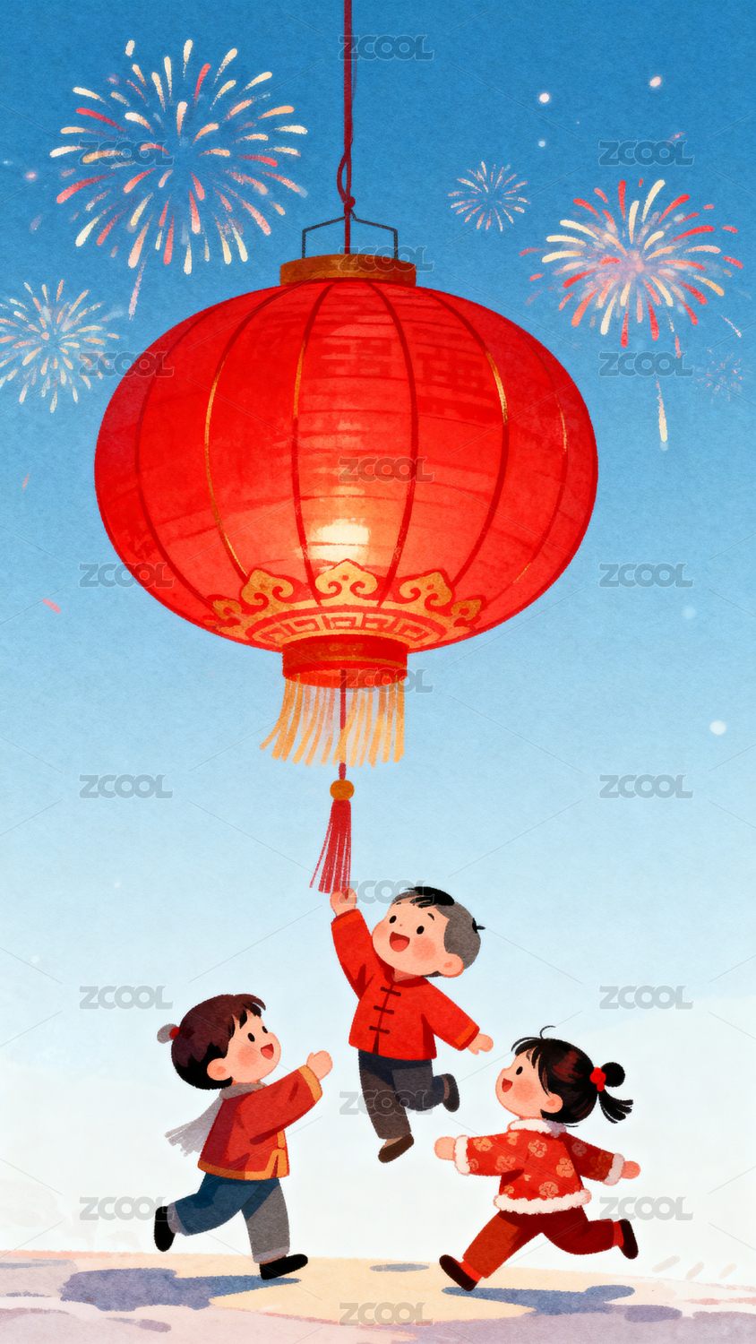 挂满灯笼的树枝下手拿福字灯笼的儿童红色新年插画竖版