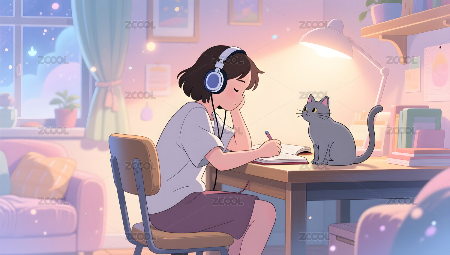 工位,工作,坐姿,笔记本,电脑,耳机,上班,插画