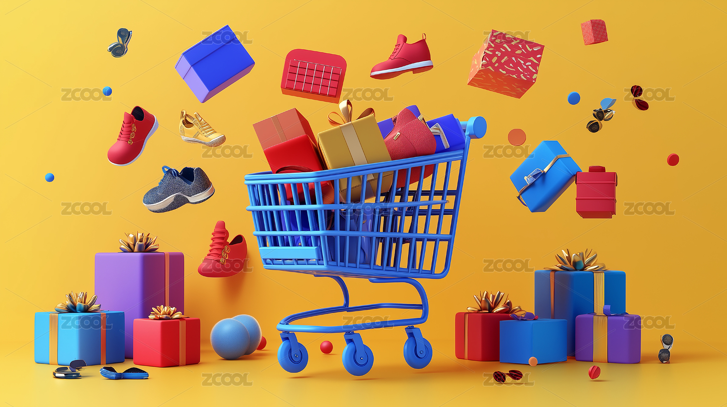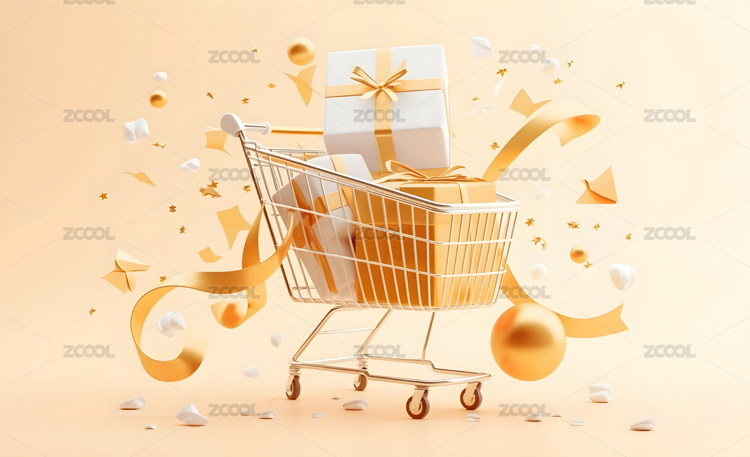 3D卡通金色购物车礼物盒节日活动场景