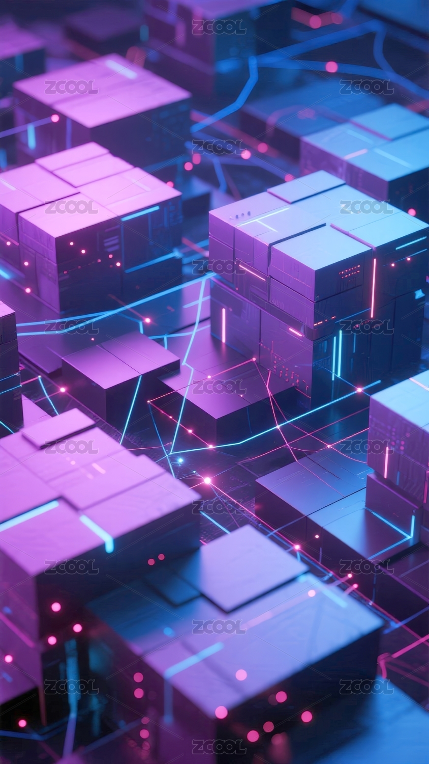 科幻抽象荧光色发光晶体城市建筑3D插画